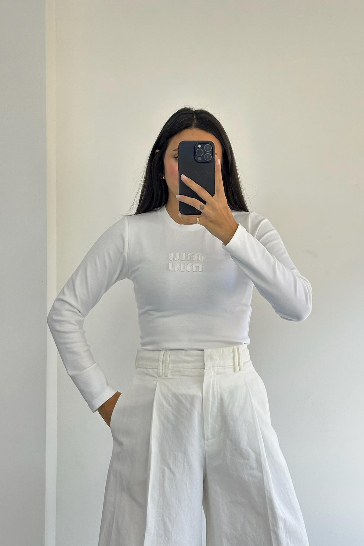 Aplike Yazılı Uzun Kollu Beyaz Body