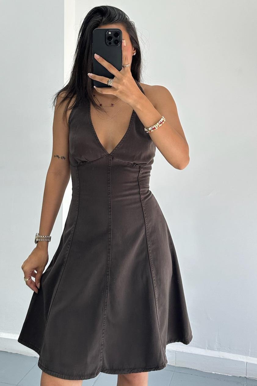Arka Bölümü Lastikli Kahverengi Kısa Elbise