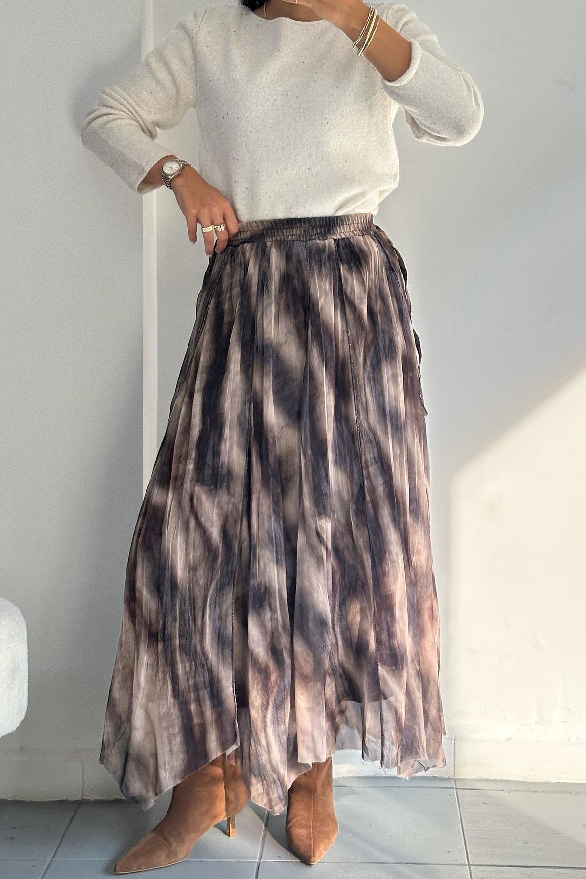 Asimetrik Kesim Desenli Kahverengi Etek