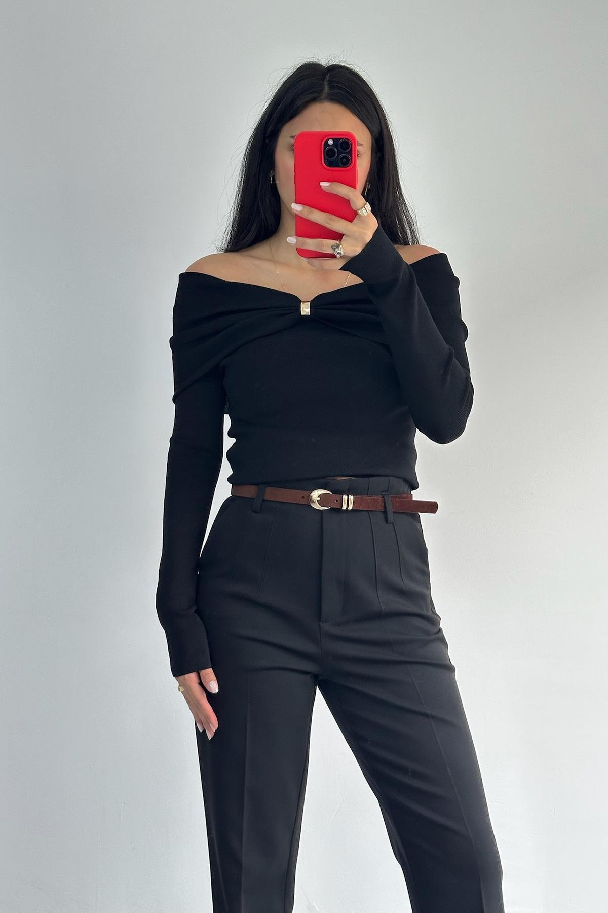 Bardot Yaka Aksesuarlı Siyah Triko Kazak