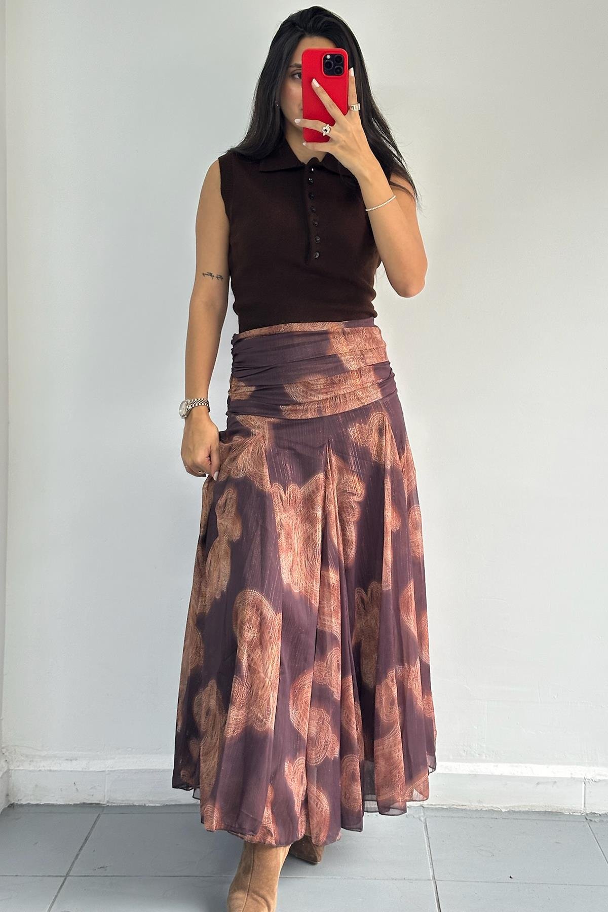 Bel Detaylı Şal Desen Kahve Etek