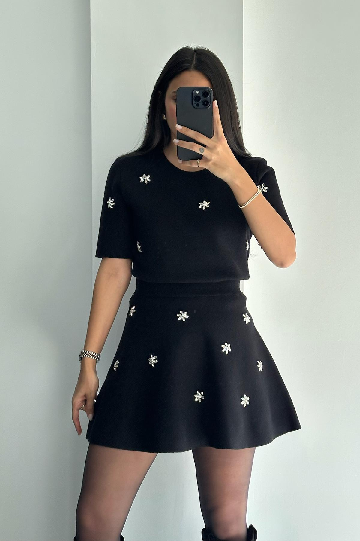 Beli Lastikli Taş İnci Nakışlı Siyah Triko Etek