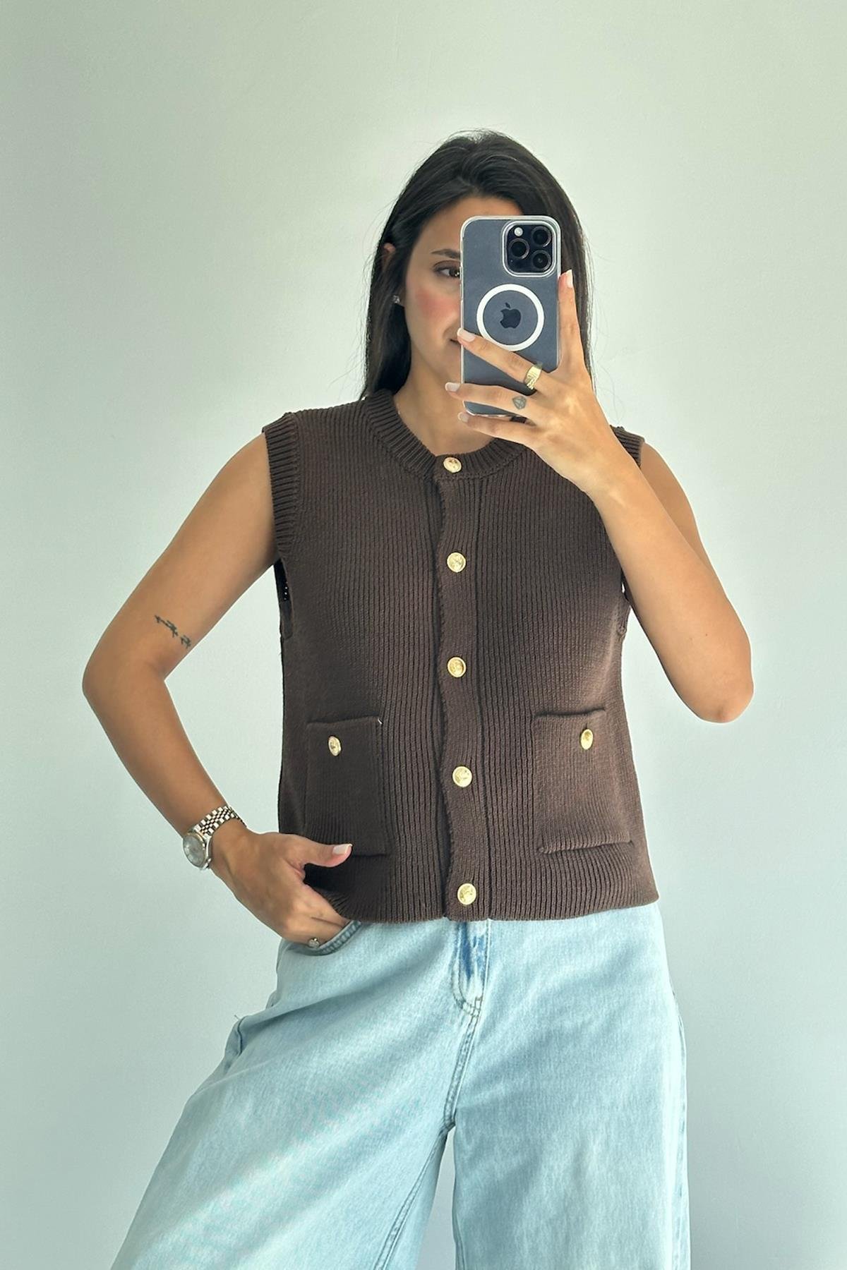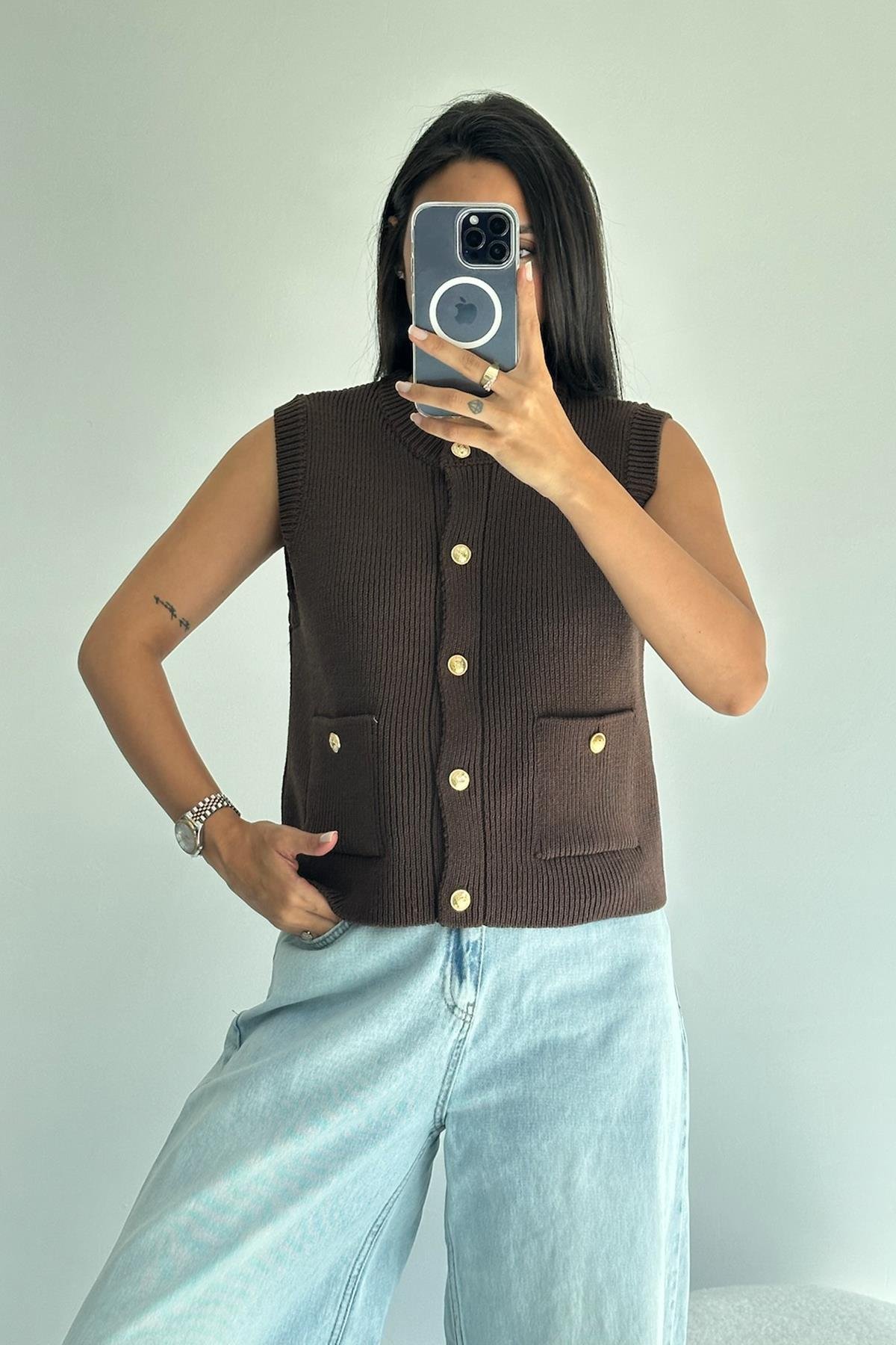 Bisiklet Yaka Kahverengi Cepli Düğmeli Triko Yelek