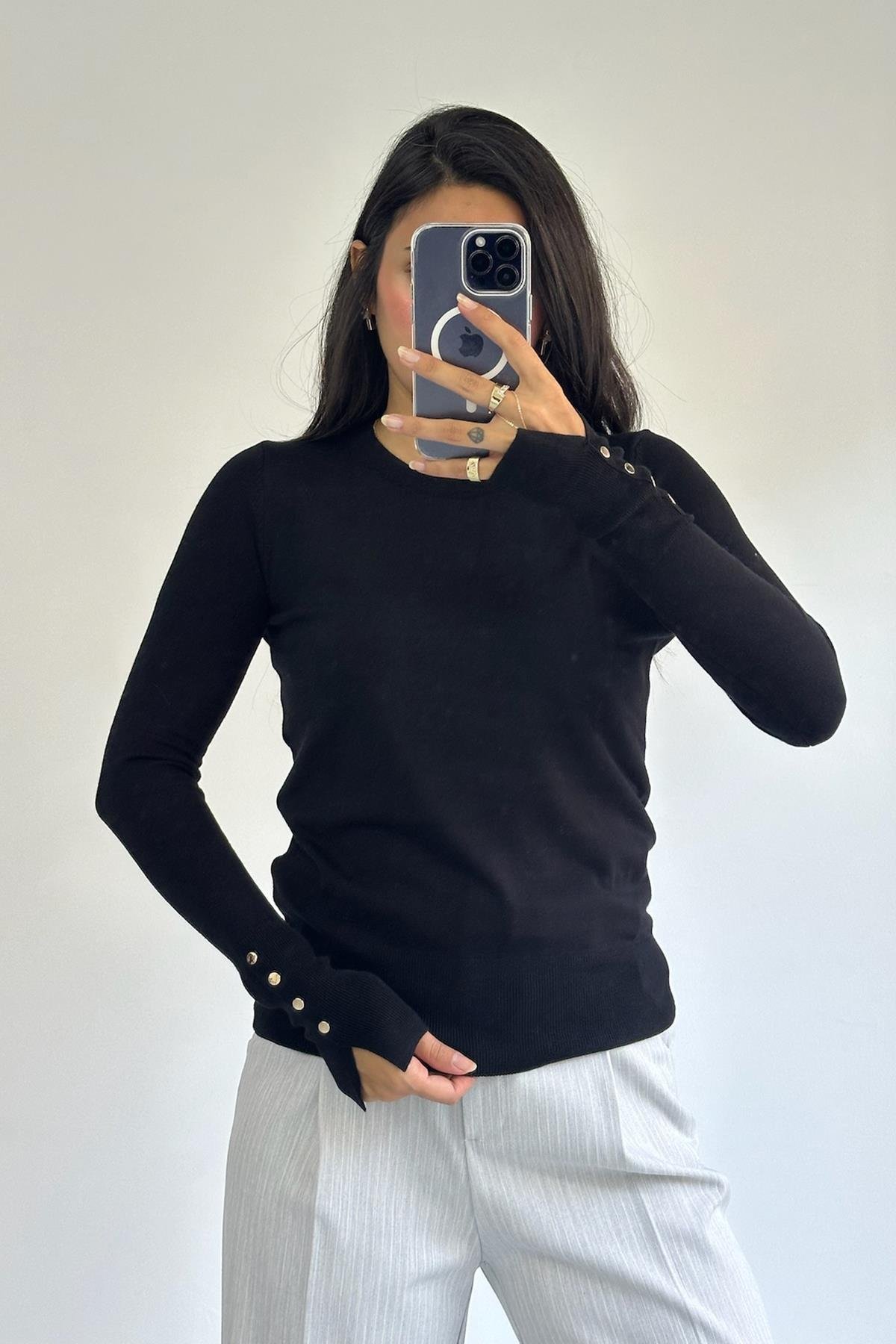 Bisiklet Yaka Kol Ortası Droplu Siyah Kazak