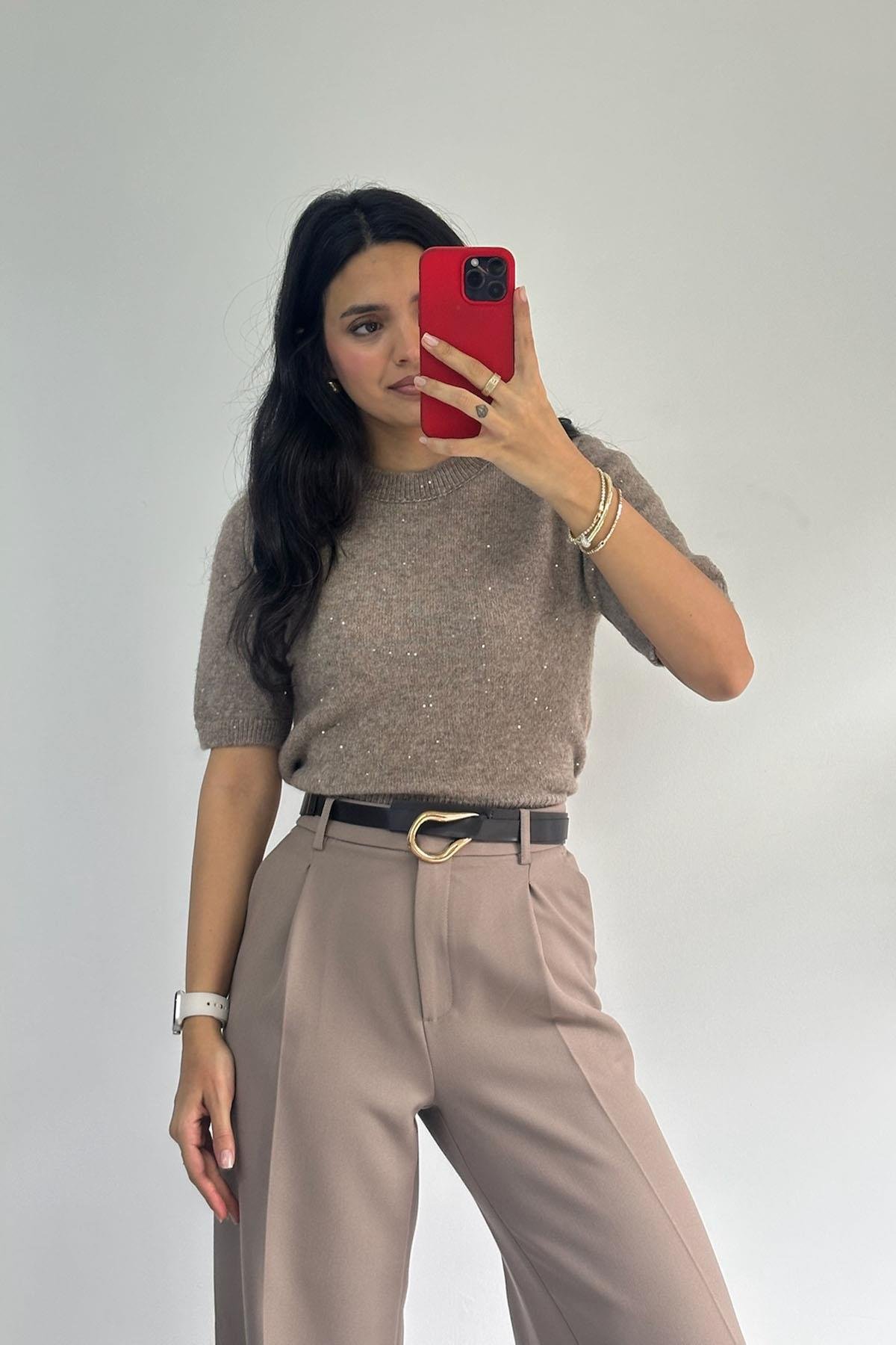 Bisiklet Yaka Simli Pullu Vizon Triko Kazak