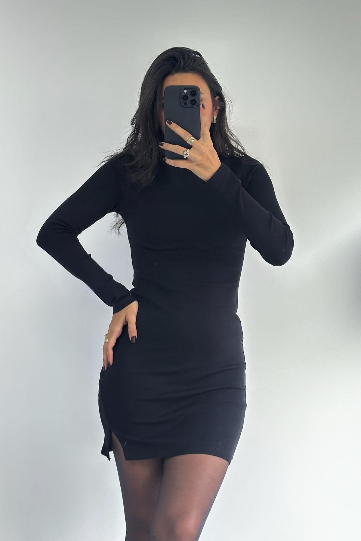 Bisiklet Yaka Uzun Kol Siyah Mini Elbise