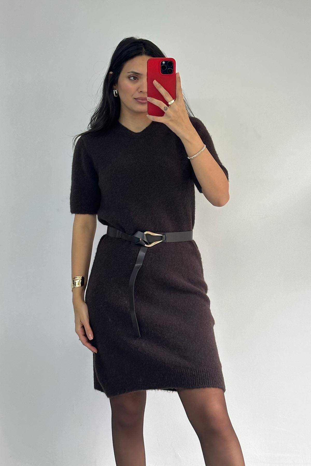 Bisiklet Yaka Yumuşak Dokulu Koyu Kahve Elbise
