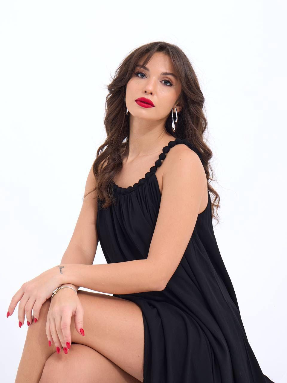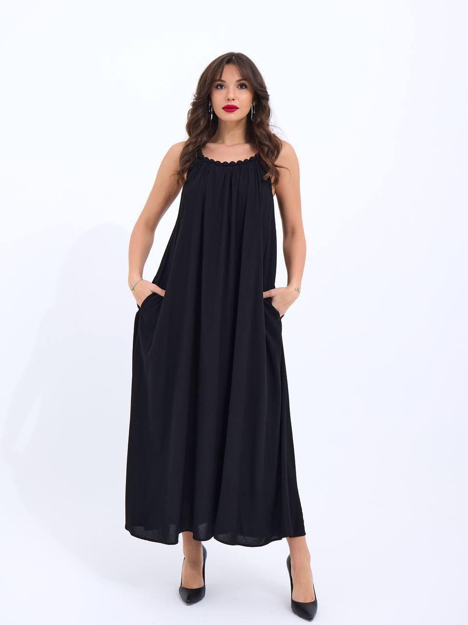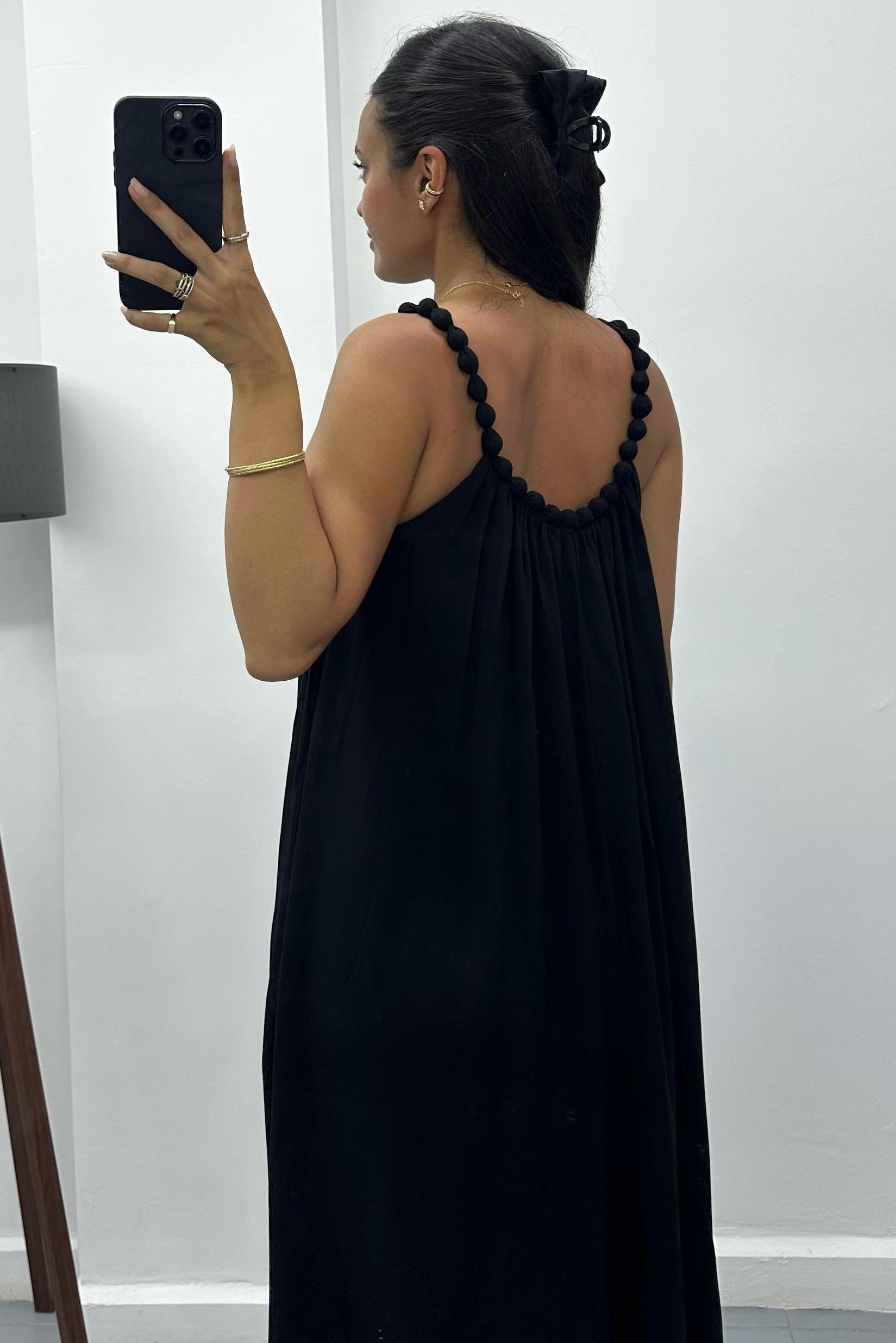Boncuk Askılı Siyah Uzun Elbise