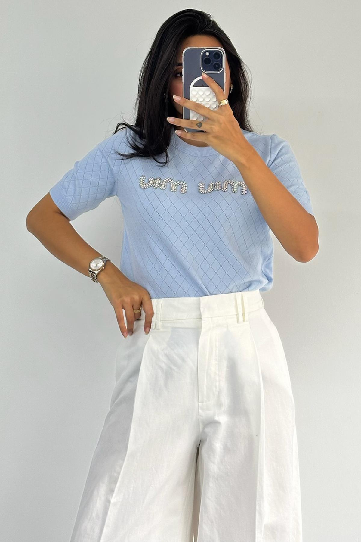 Boncuk Detaylı Kısa Kollu Açık Mavi Triko Bluz