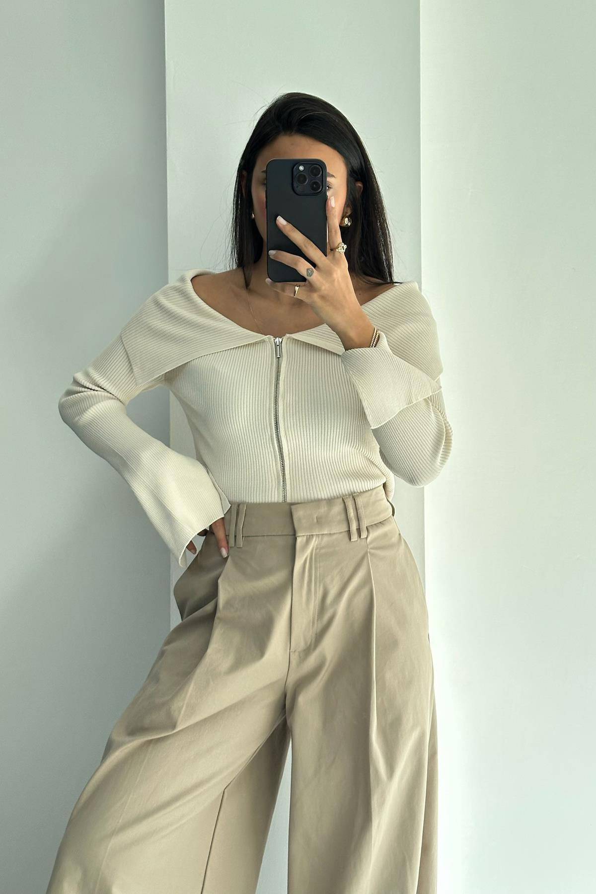 Bordot Yaka Kol Detay Açık Natural Fermuarlı Hırka