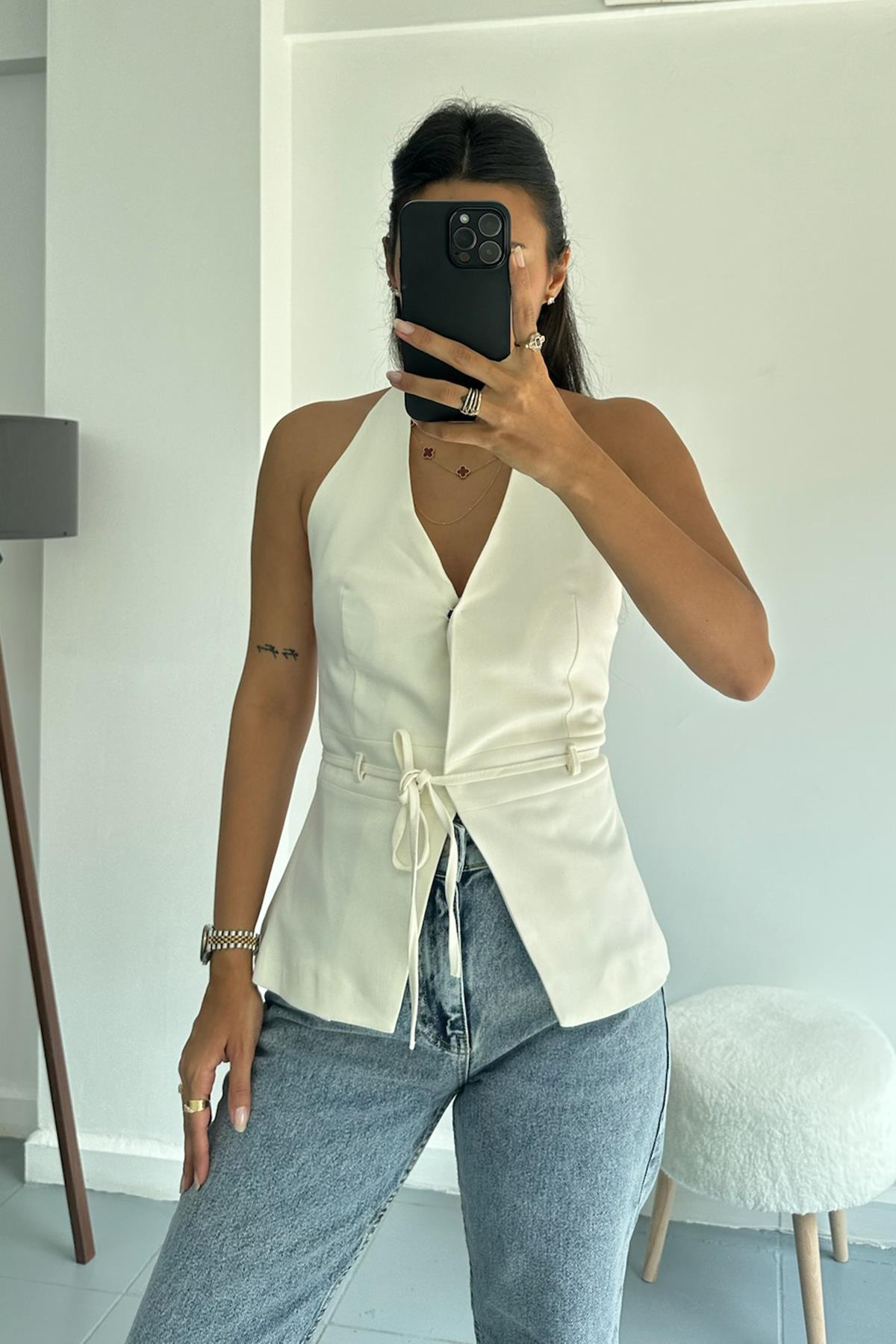 Boyundan Bağlı Ekru Yelek