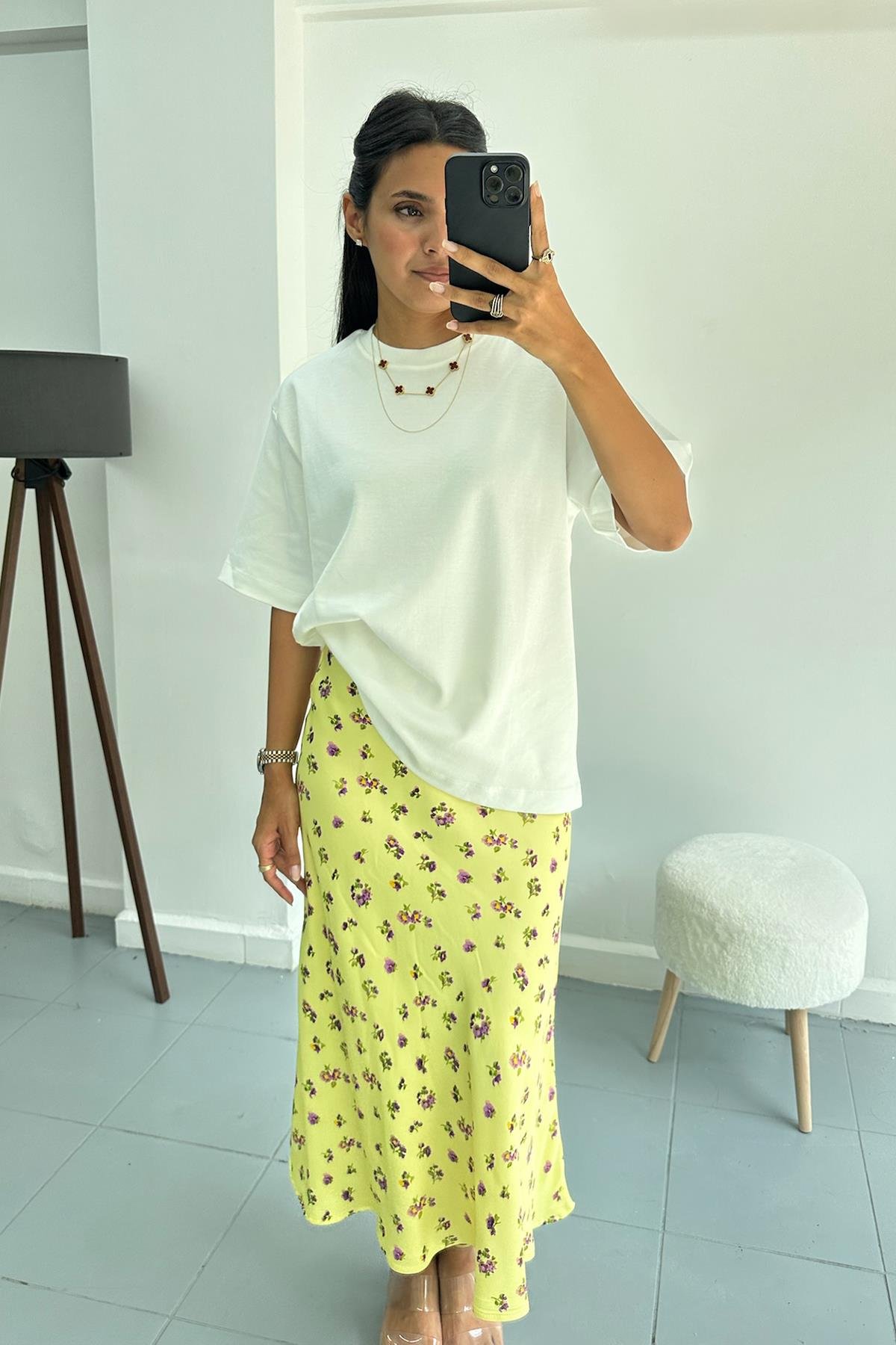 Çiçek Desenli Sarı Saten Etek