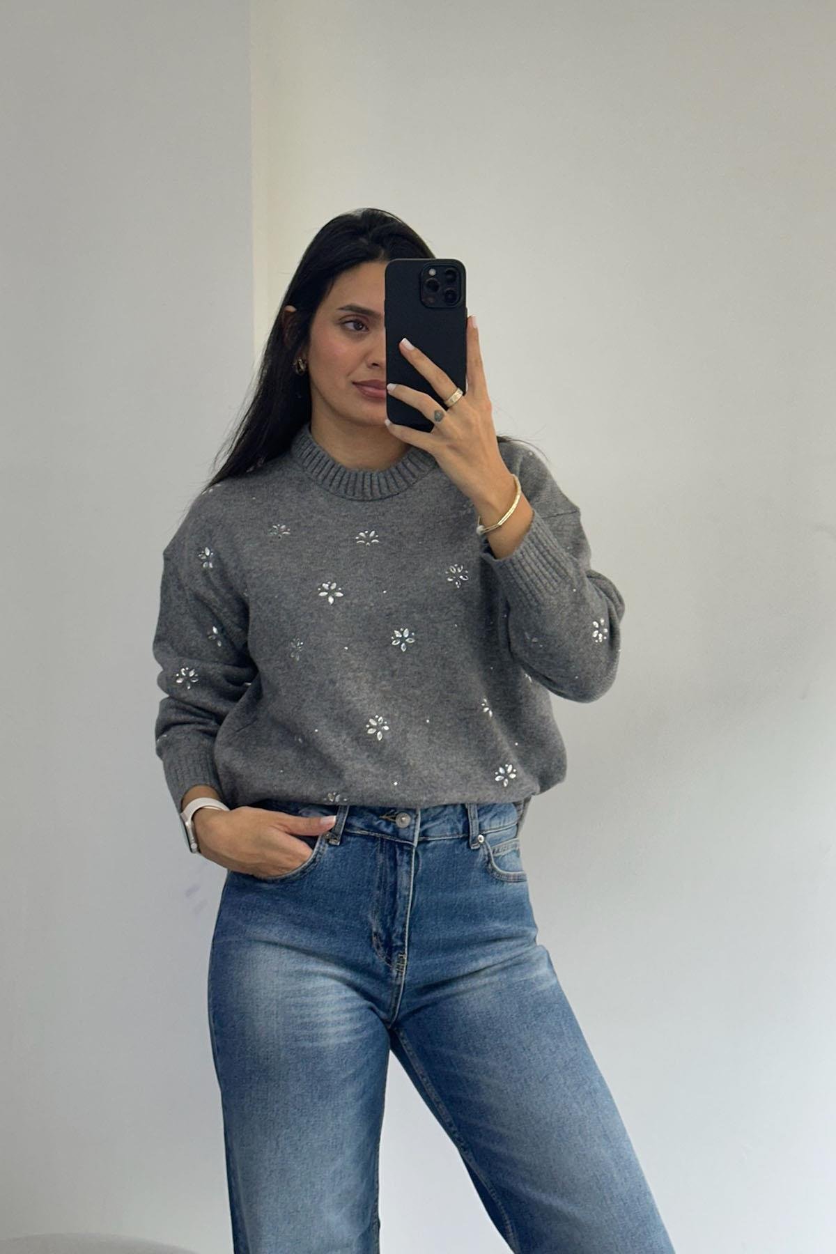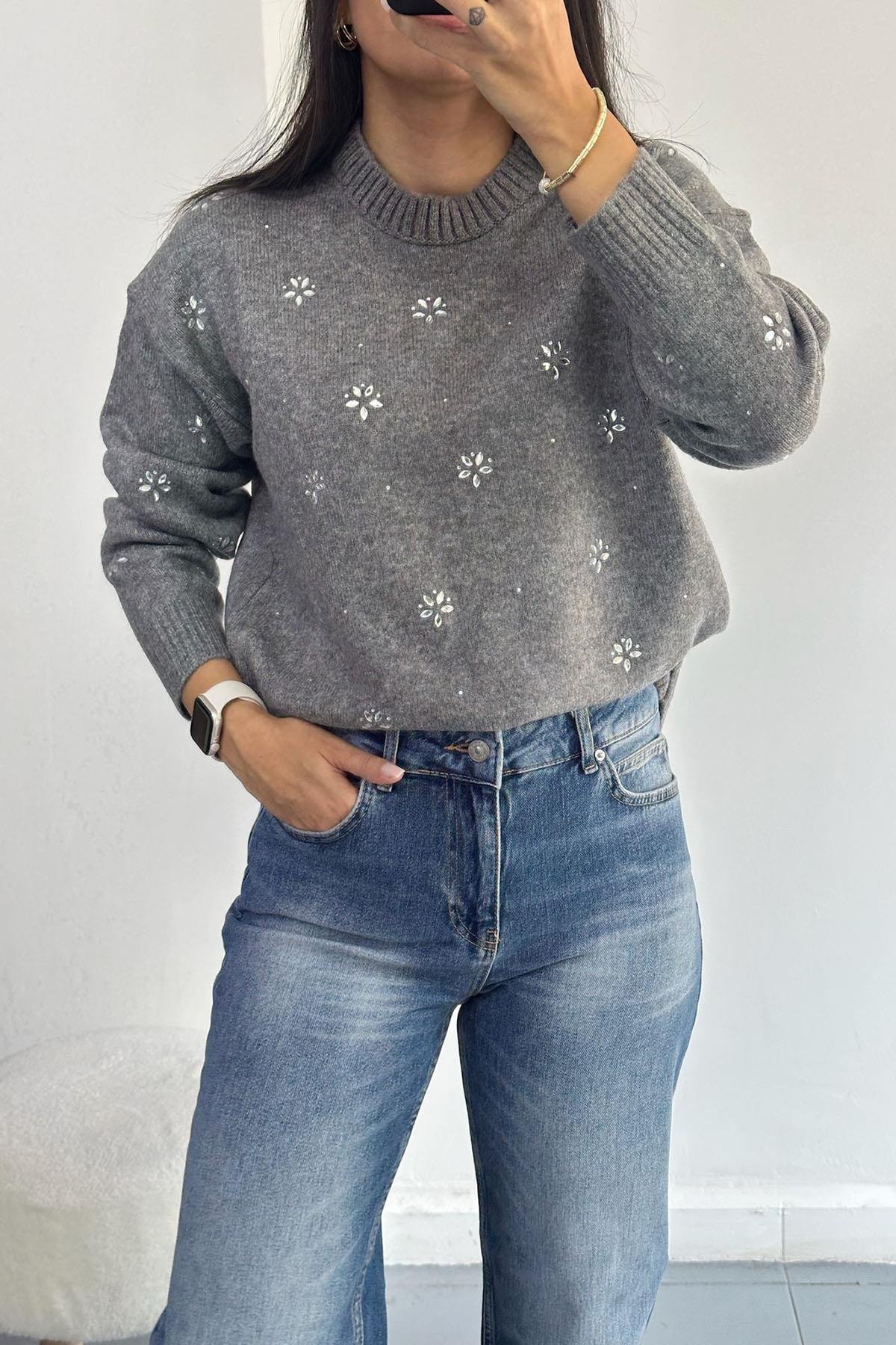 Çiçek Taşlı Gri Triko Kazak
