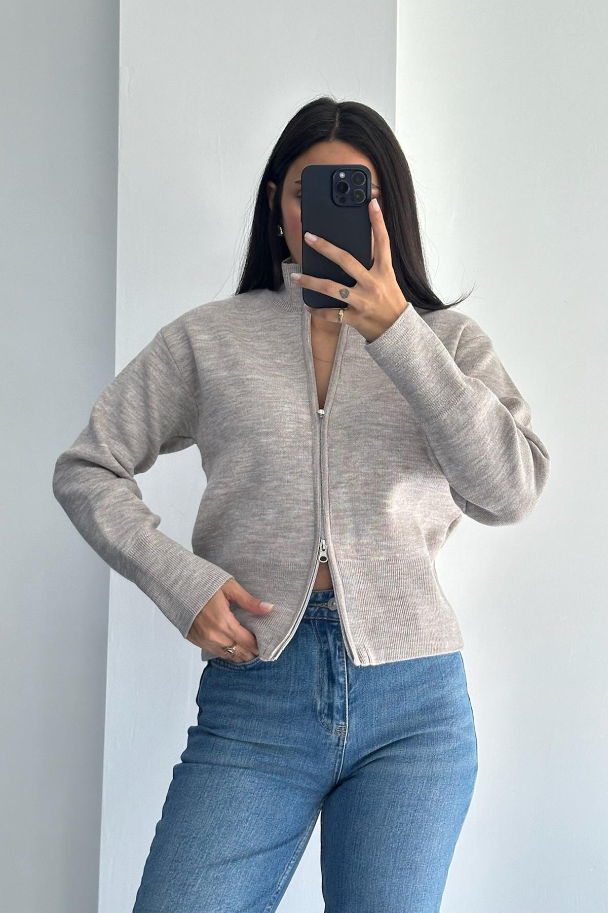 Çift Fermuarlı Koyu Bej Triko Hırka