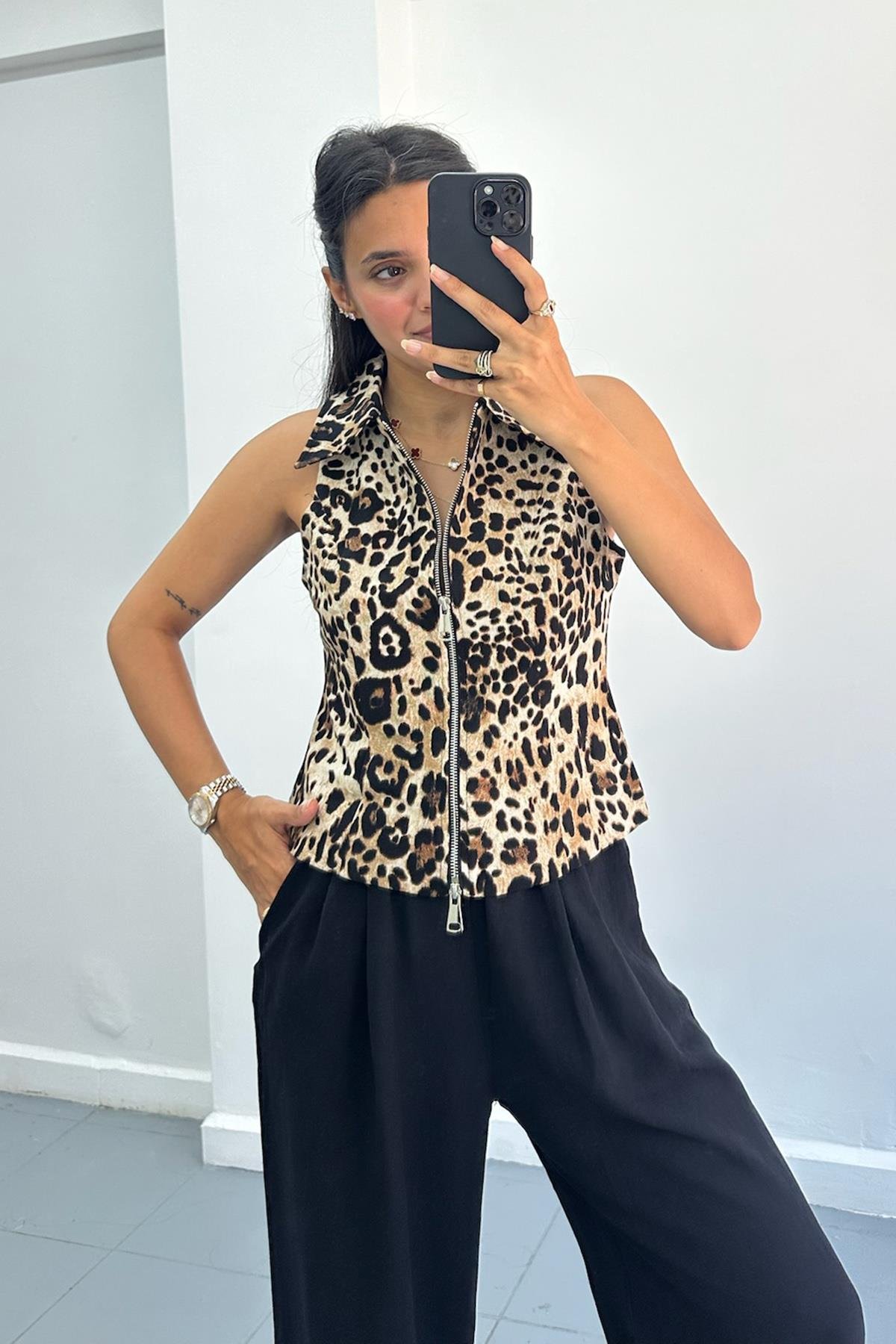 Çift Fermuarlı Yakalı Leopar Yelek