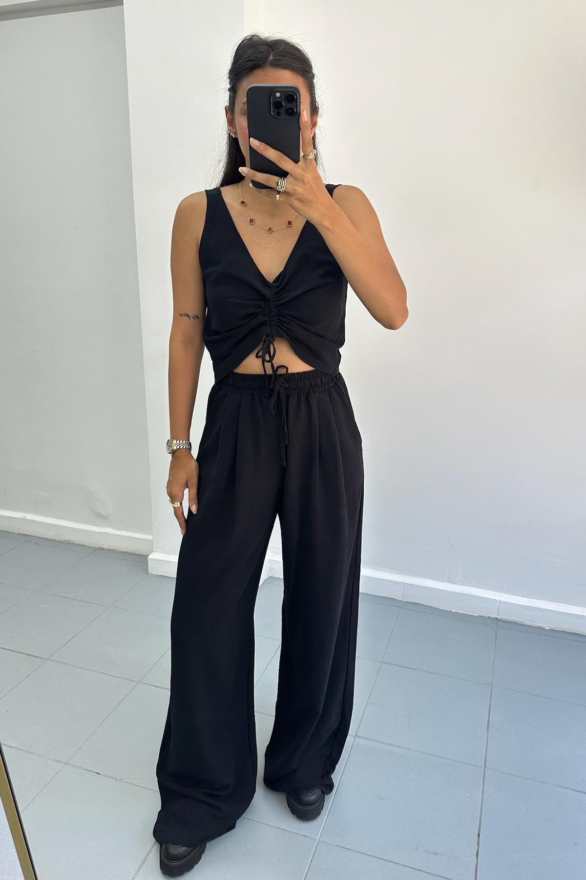 Çift Pile Keten Siyah Takım