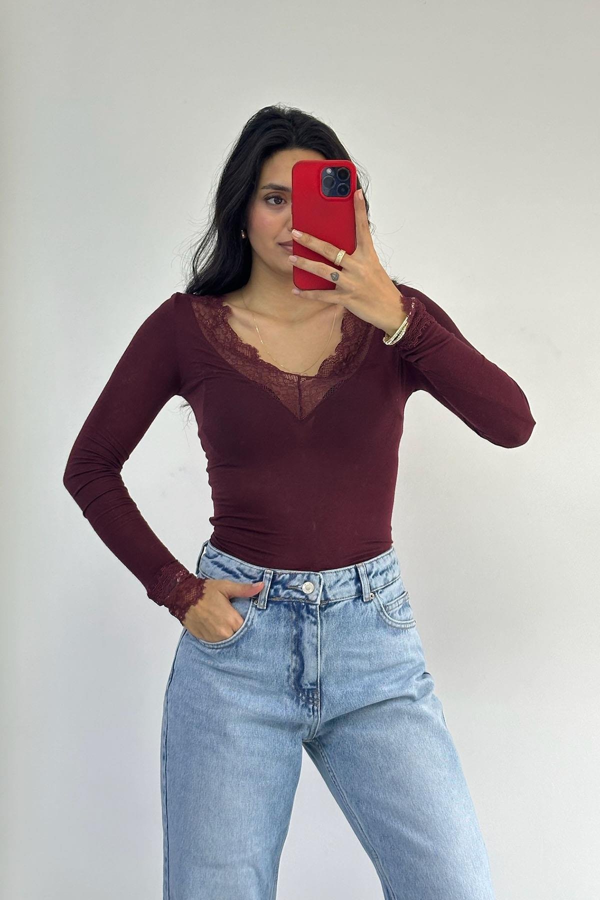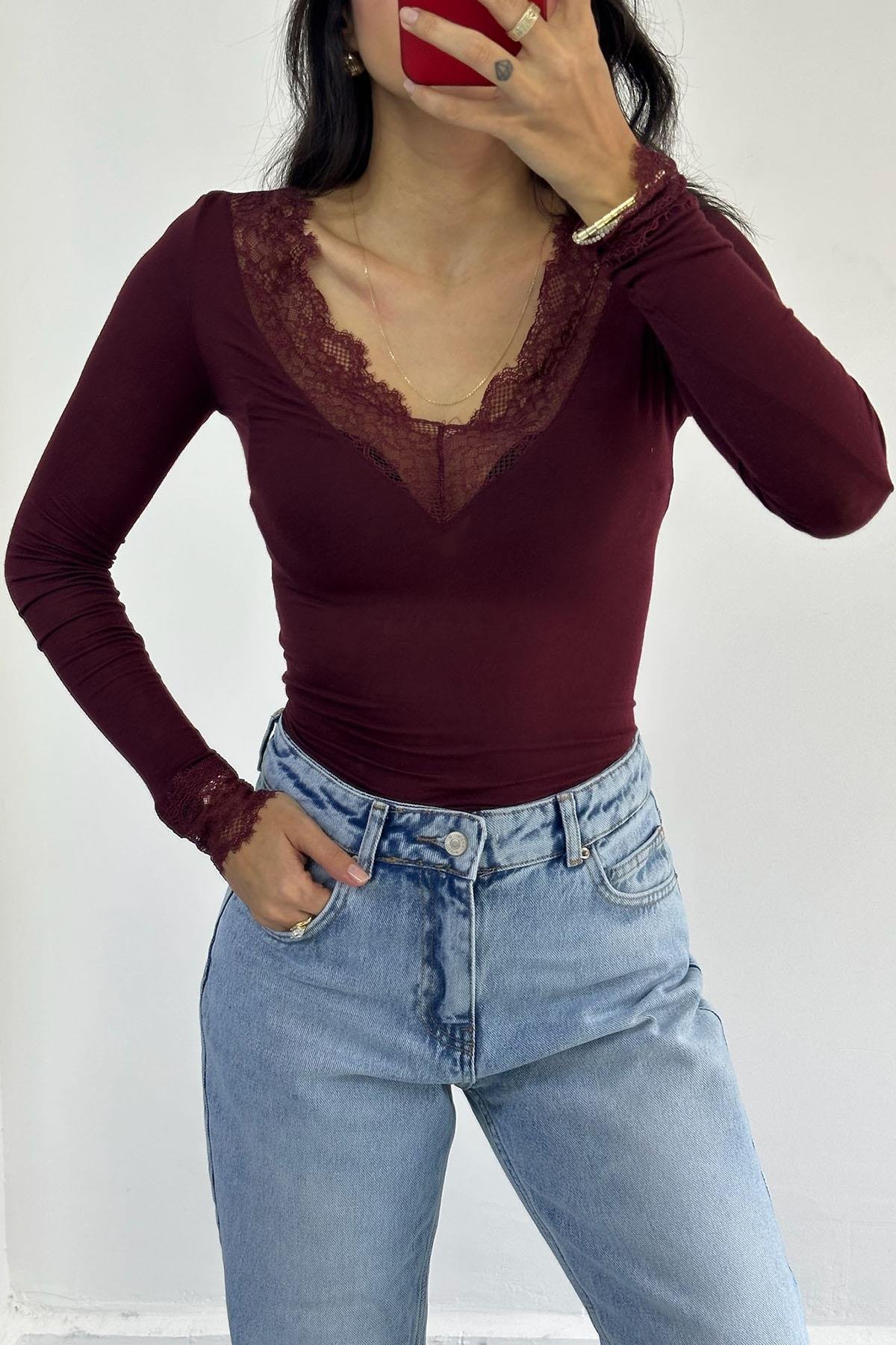 Dantelli Bordo Kaşmir Bluz