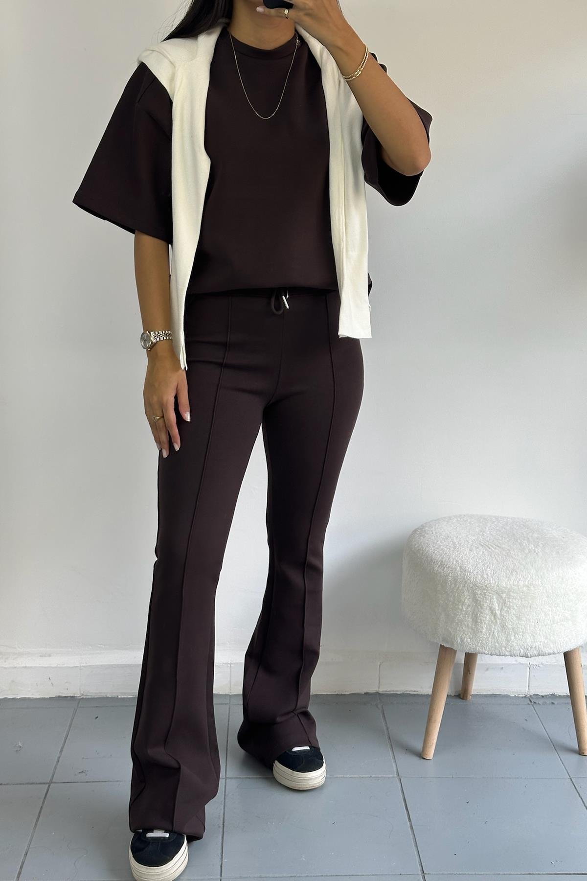 Dikiş Detaylı Koyu Kahve İnterlok Pantolon Bluz Takım