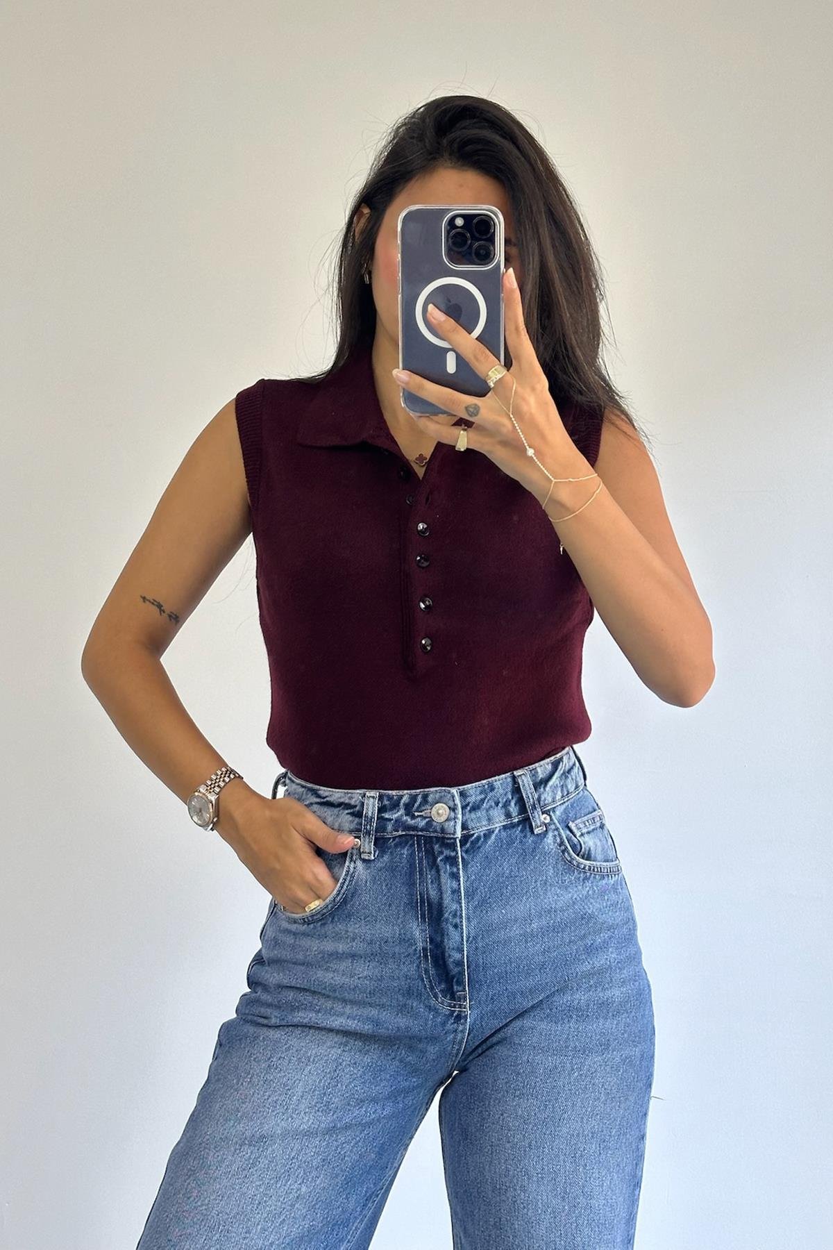 Düğmeli Kolsuz Bordo Kazak