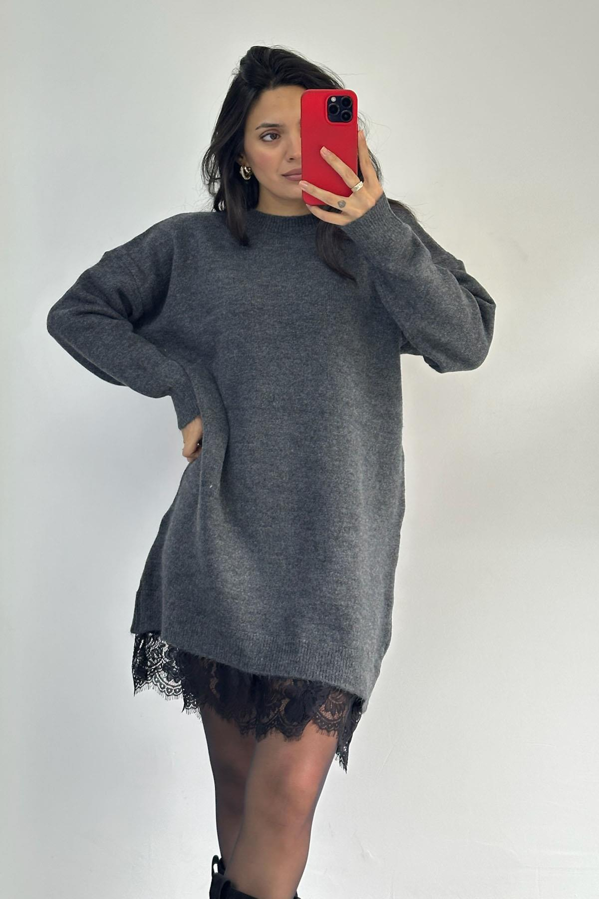 Etek Ucu Dantelli Antrasit Triko Elbise