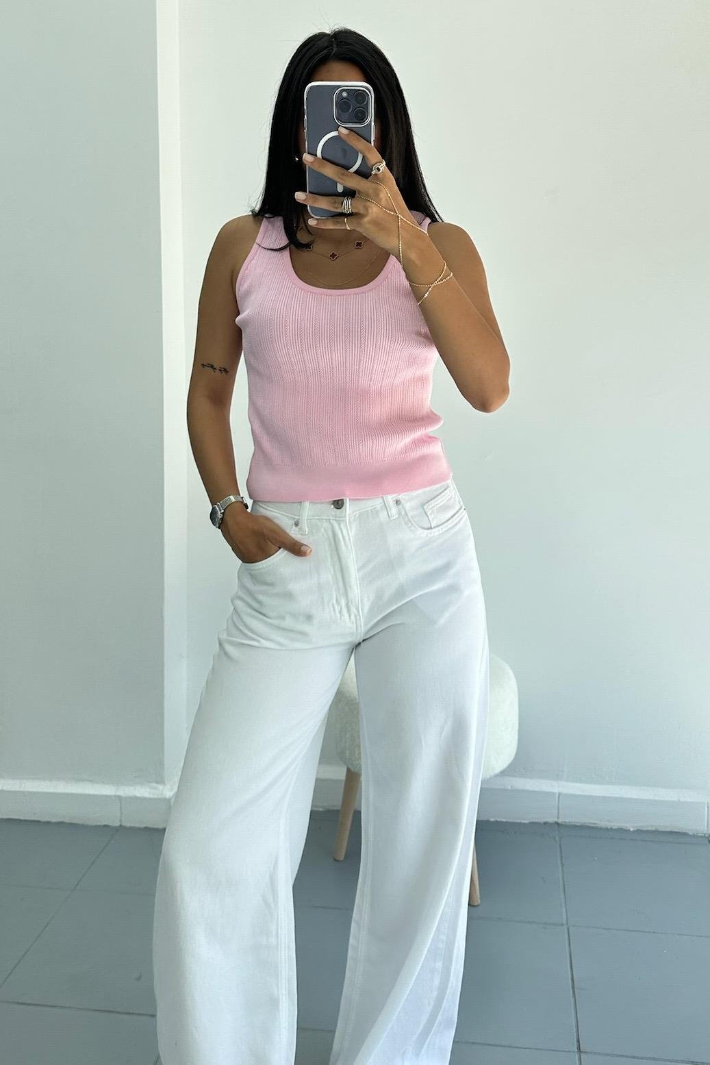 Fitilli Ajurlu Triko Pembe Bluz
