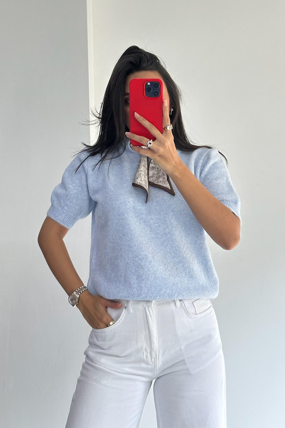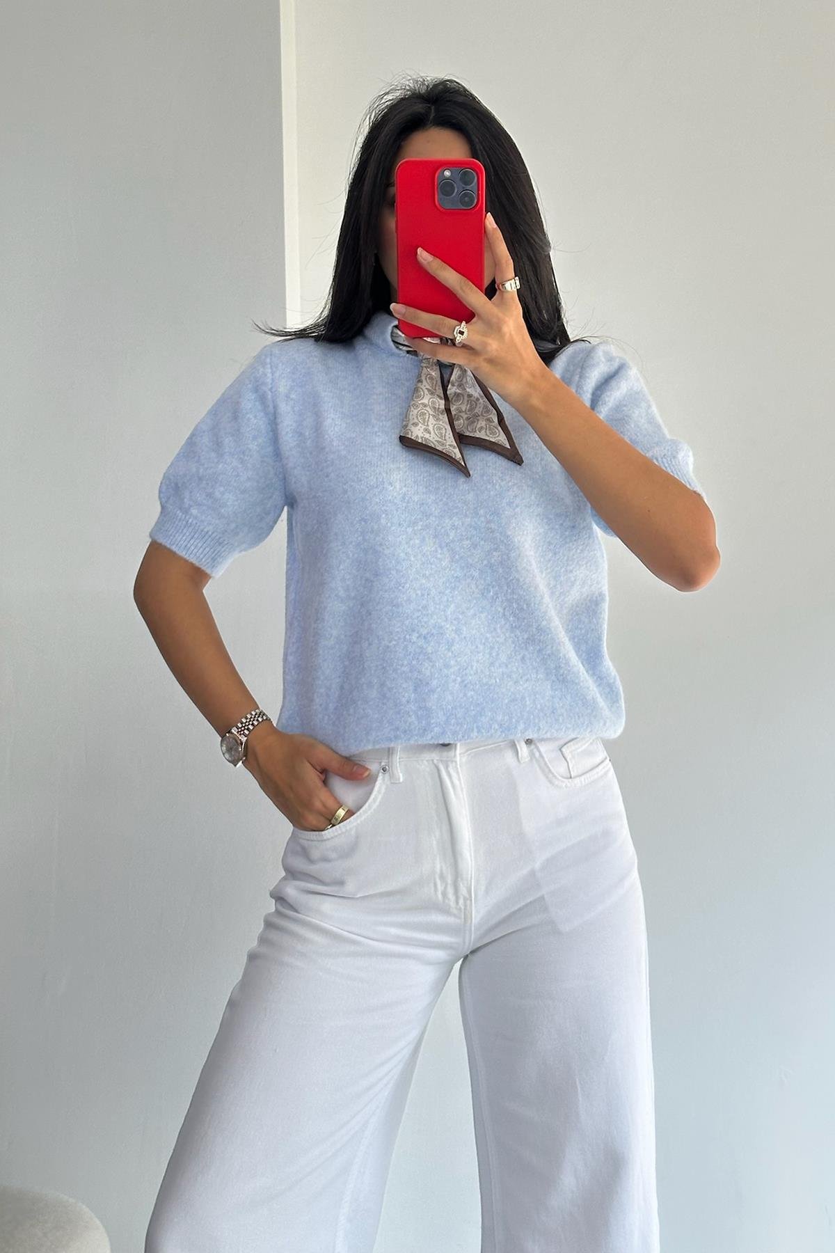 Fularlı Mavi Kısa Kol Kazak