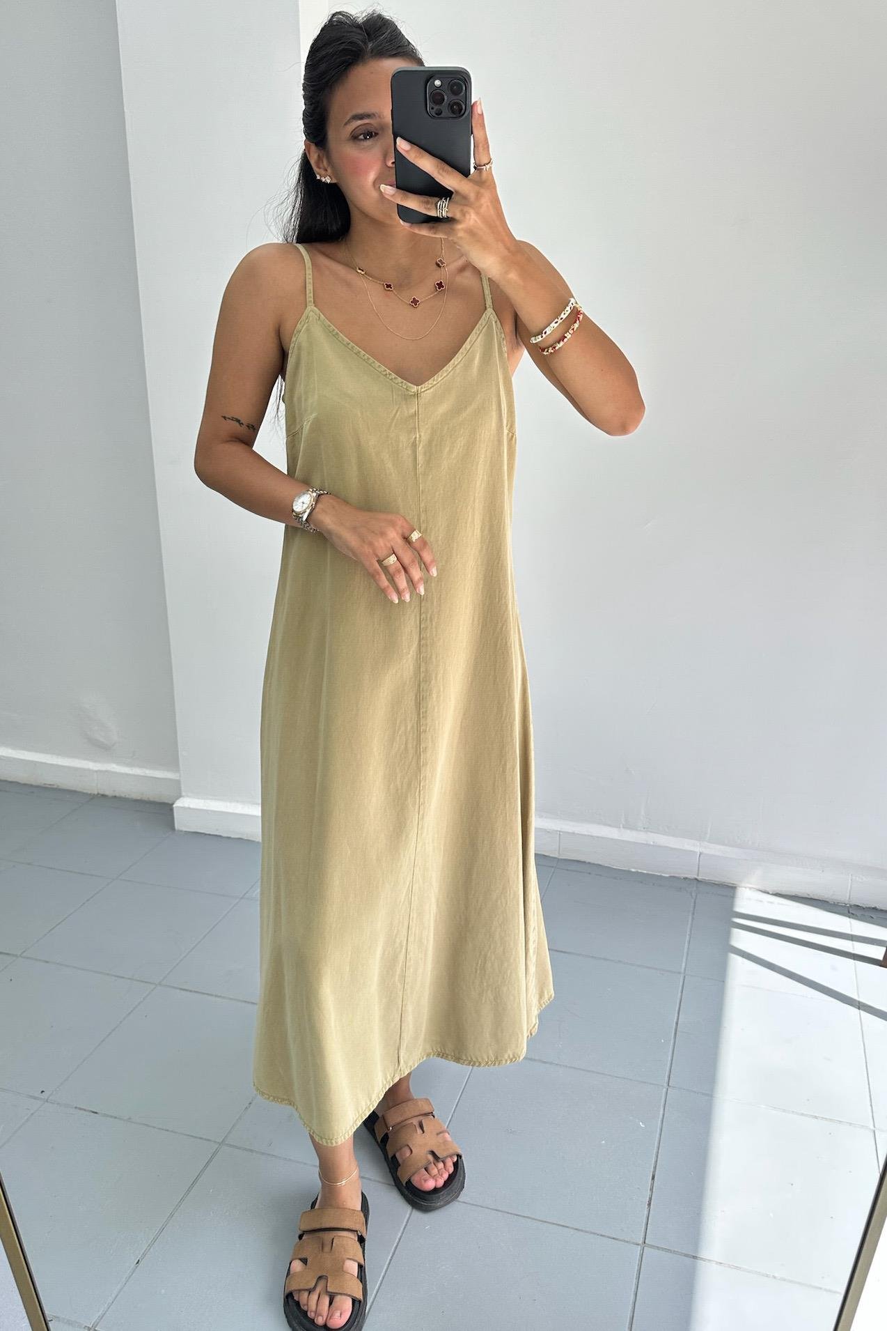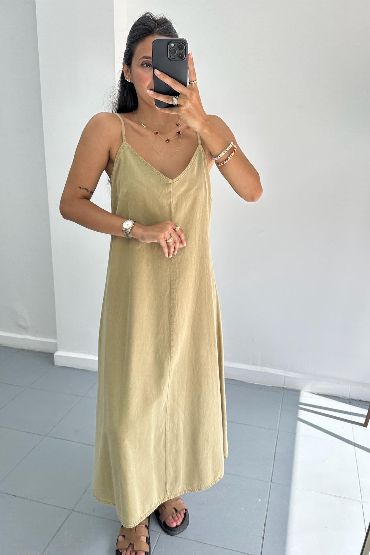 İnce Askılı Parçaboya Denim Çağla Elbise