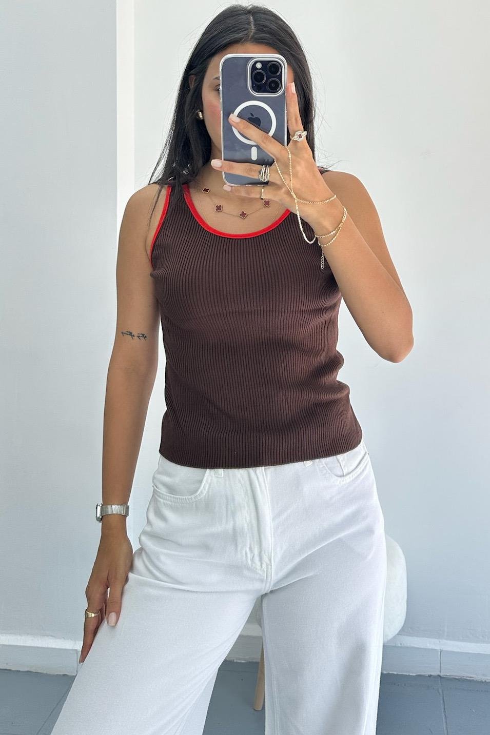 Kalın Askılı Fitilli Kontrast İnce Kahve Triko Bluz