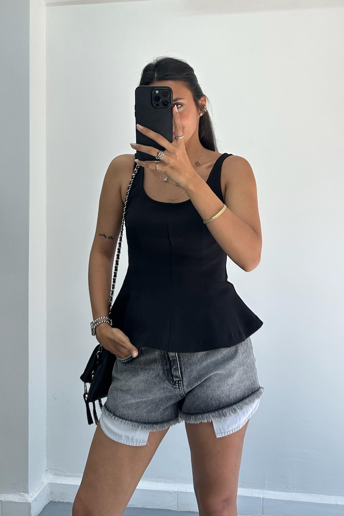 Kalın Askılı Siyah Peplum Top
