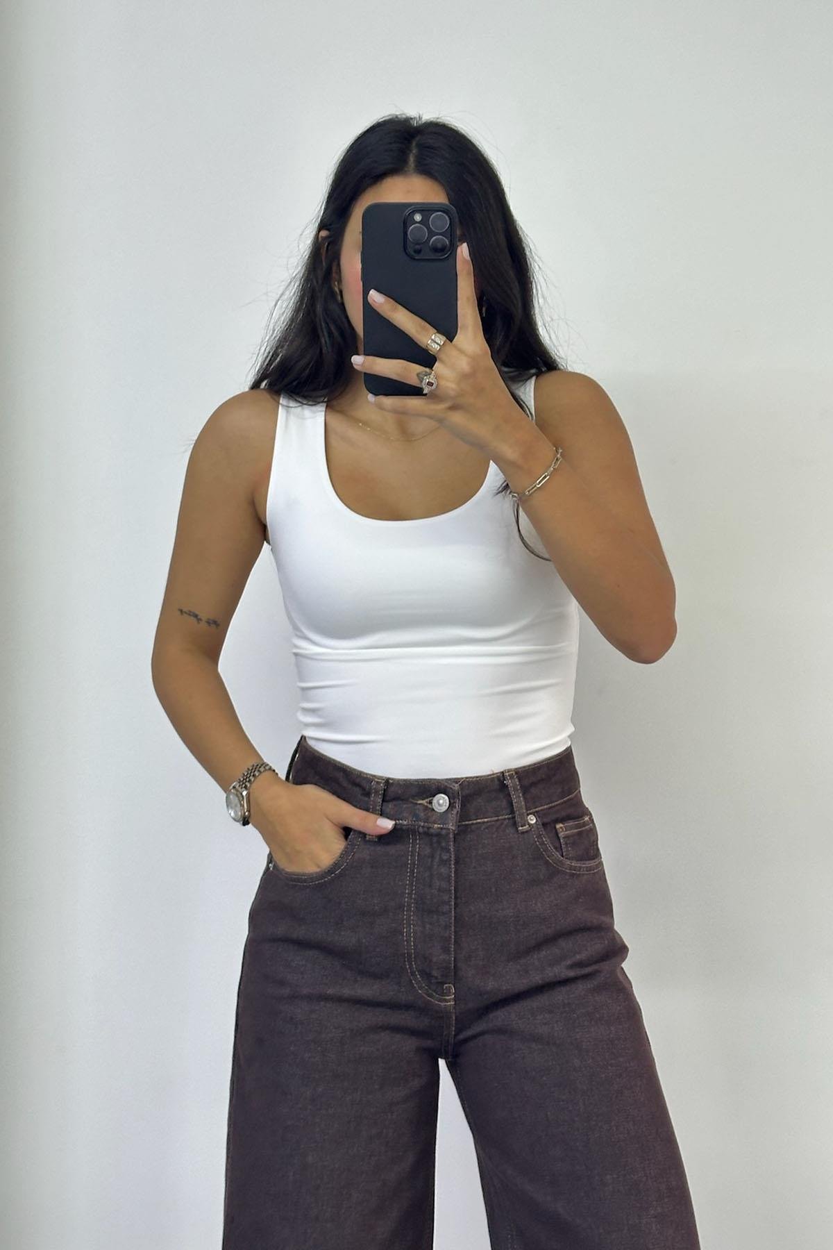 Kare Yaka Örme Ekru Atlet