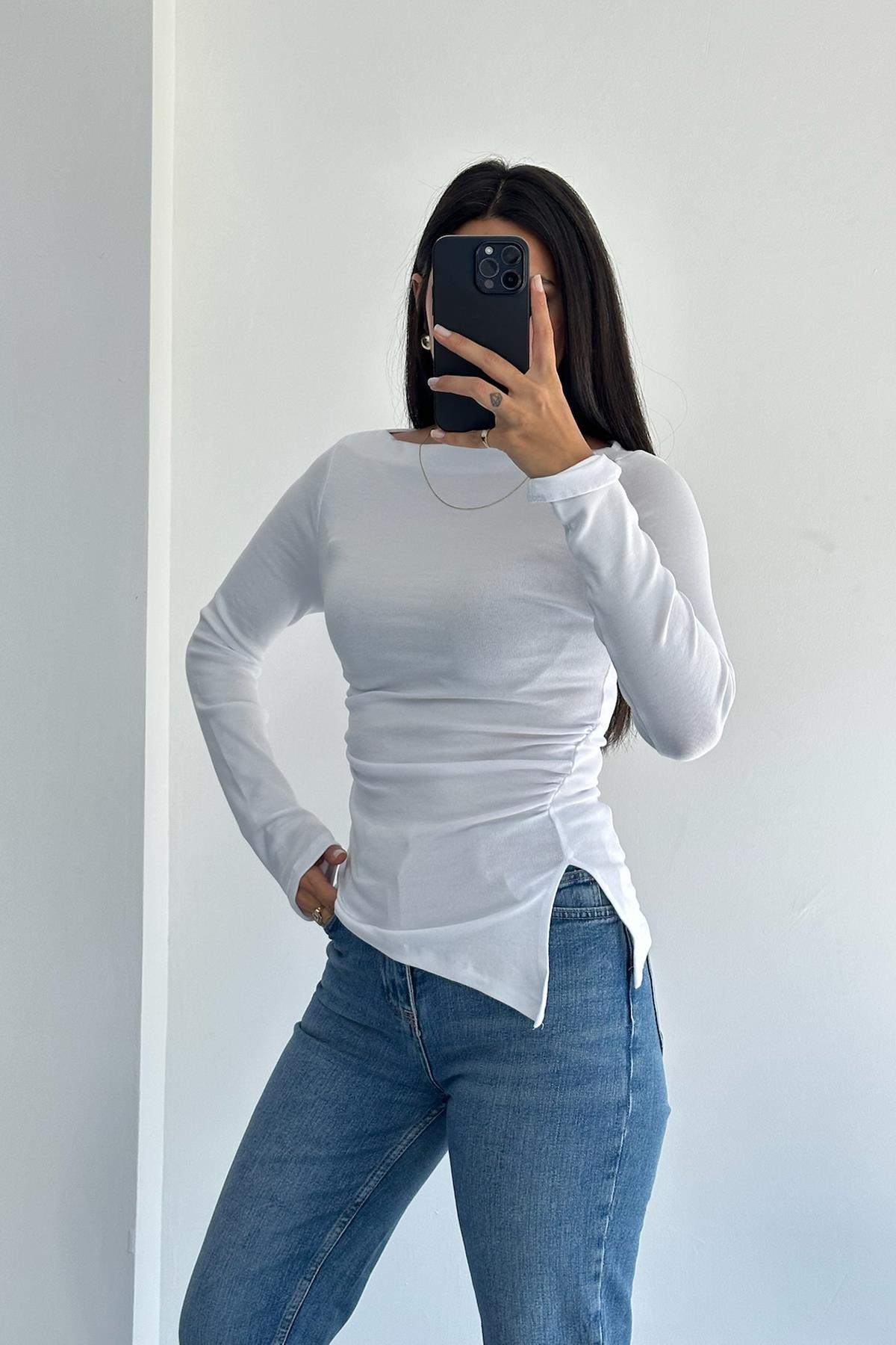 Kayık Yaka Asimetrik Kesim Beyaz Bluz