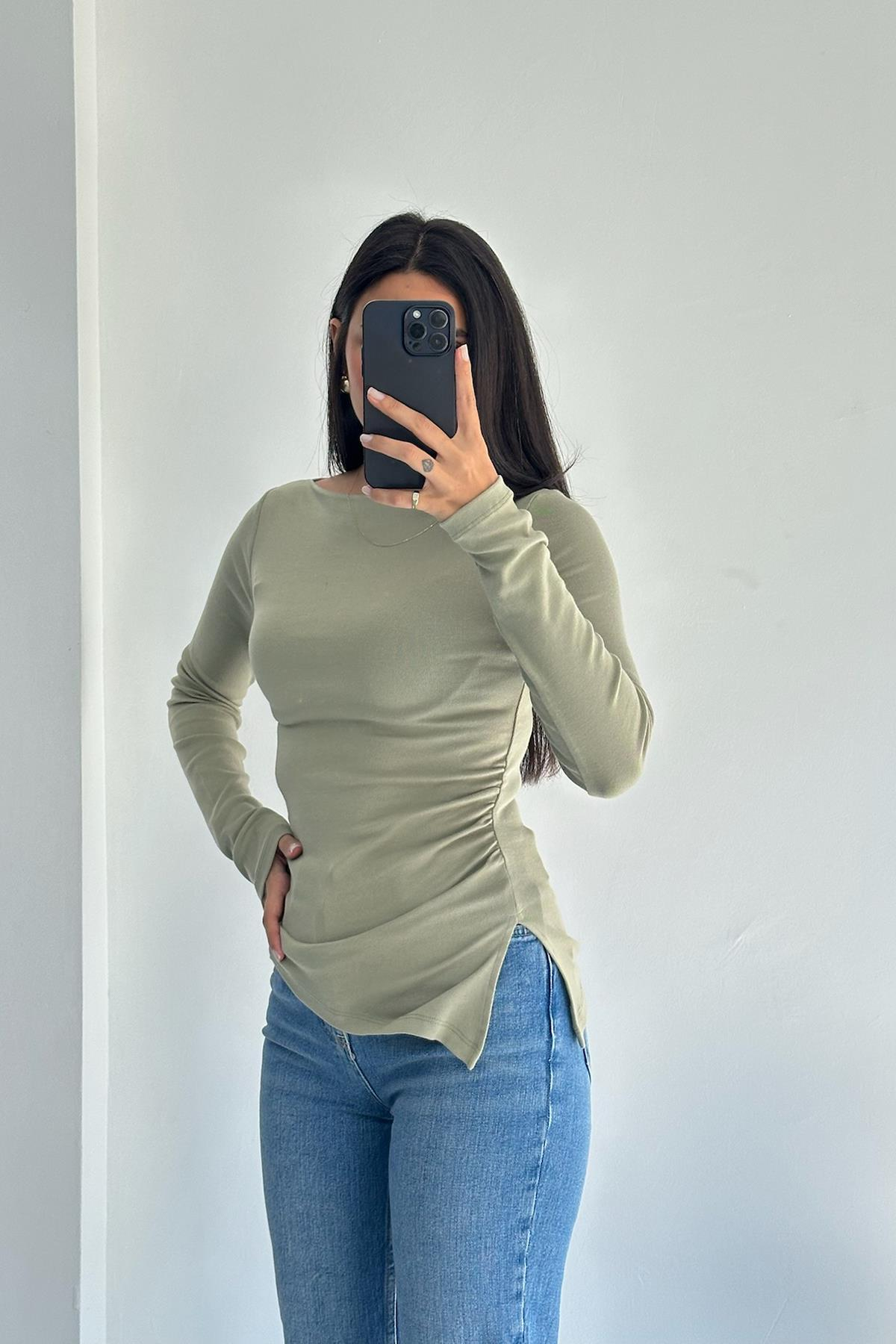 Kayık Yaka Asimetrik Kesim Çağla Bluz