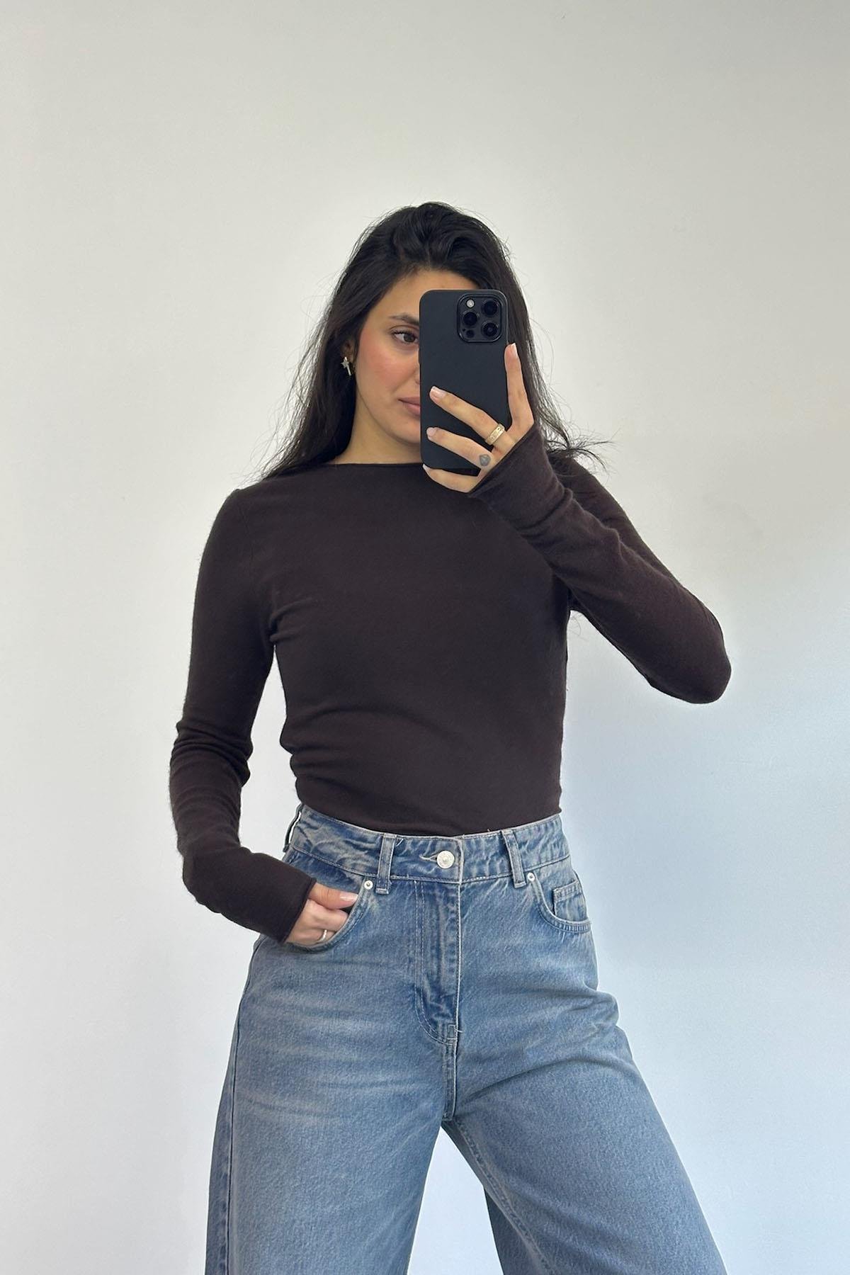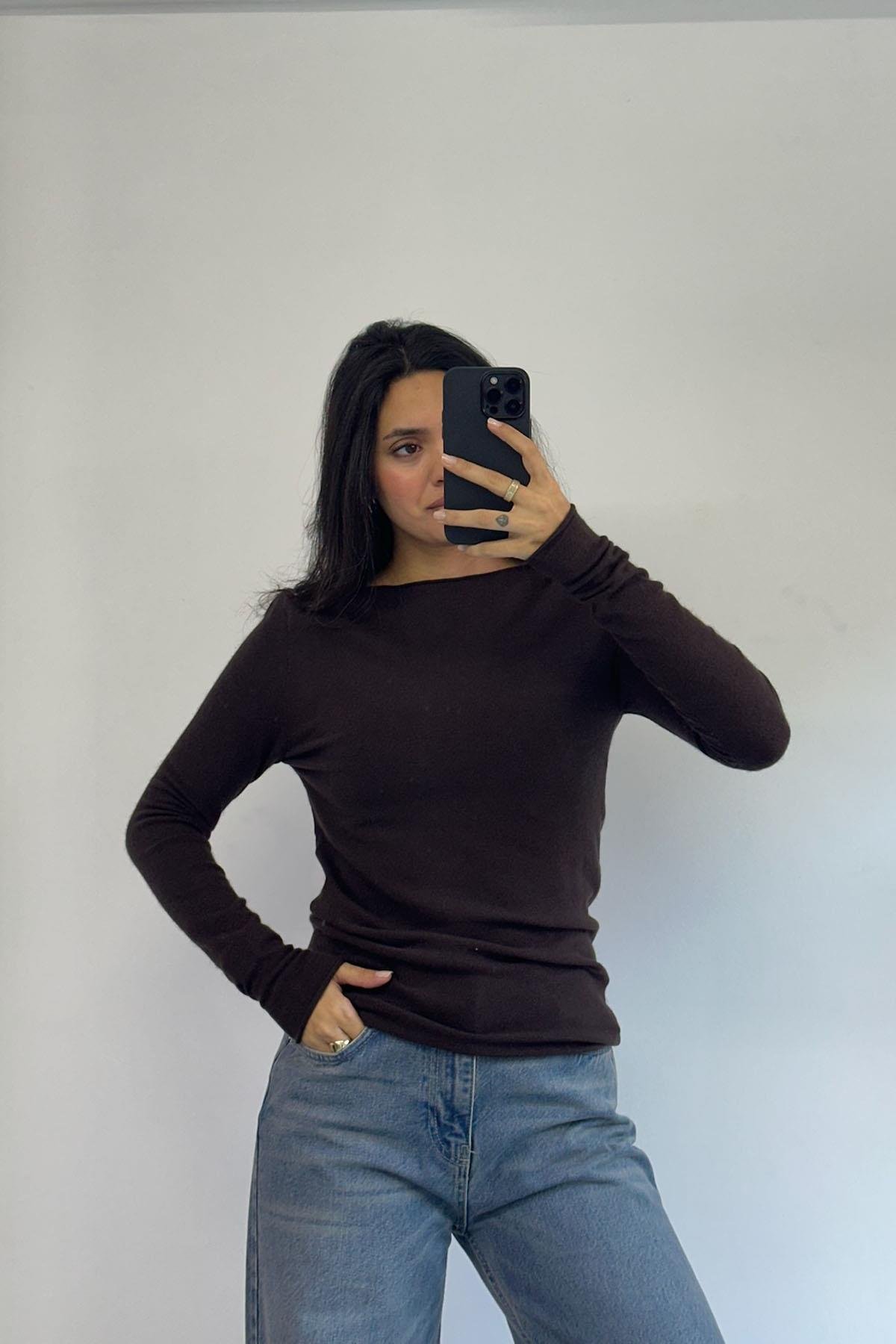 Kayık Yaka Kaşmirli Koyu Kahve Triko Kazak
