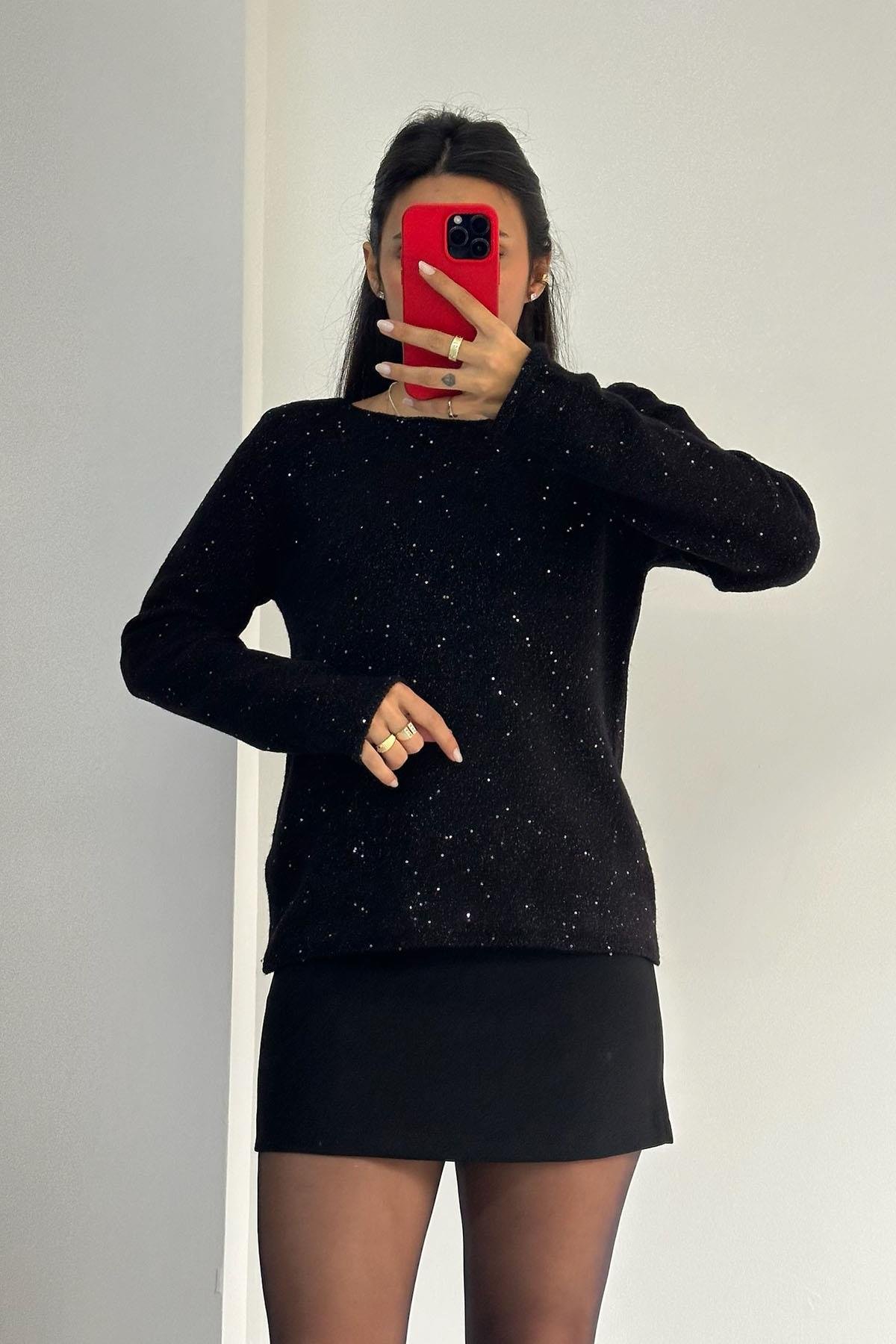Kayık Yaka Pullu Simli Siyah Triko Kazak