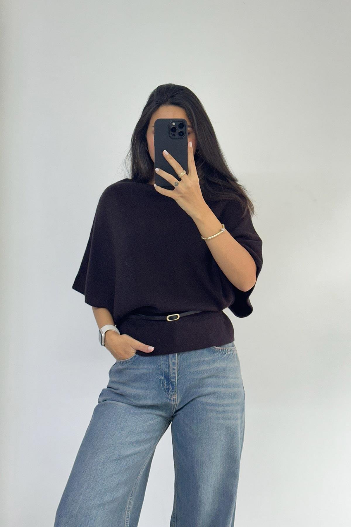 Kayık Yaka Yarasa Kol Kemerli Kahve Triko Kazak