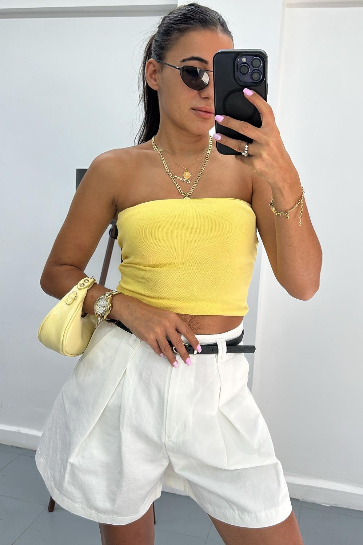 Kemerli Pensli Beyaz Bermuda