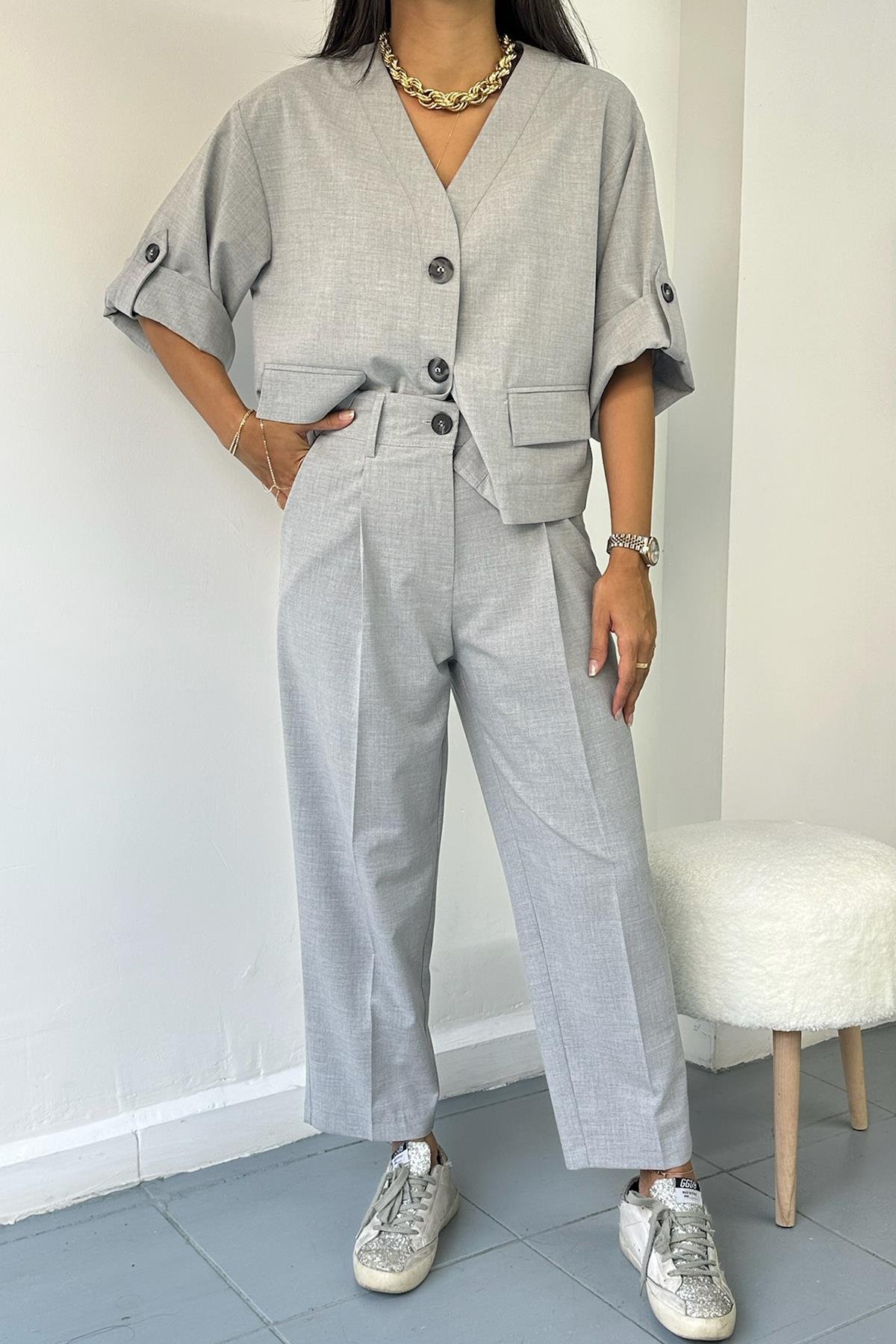 Kıvrılmış Kollu Gri Ceket Pantolon Takım