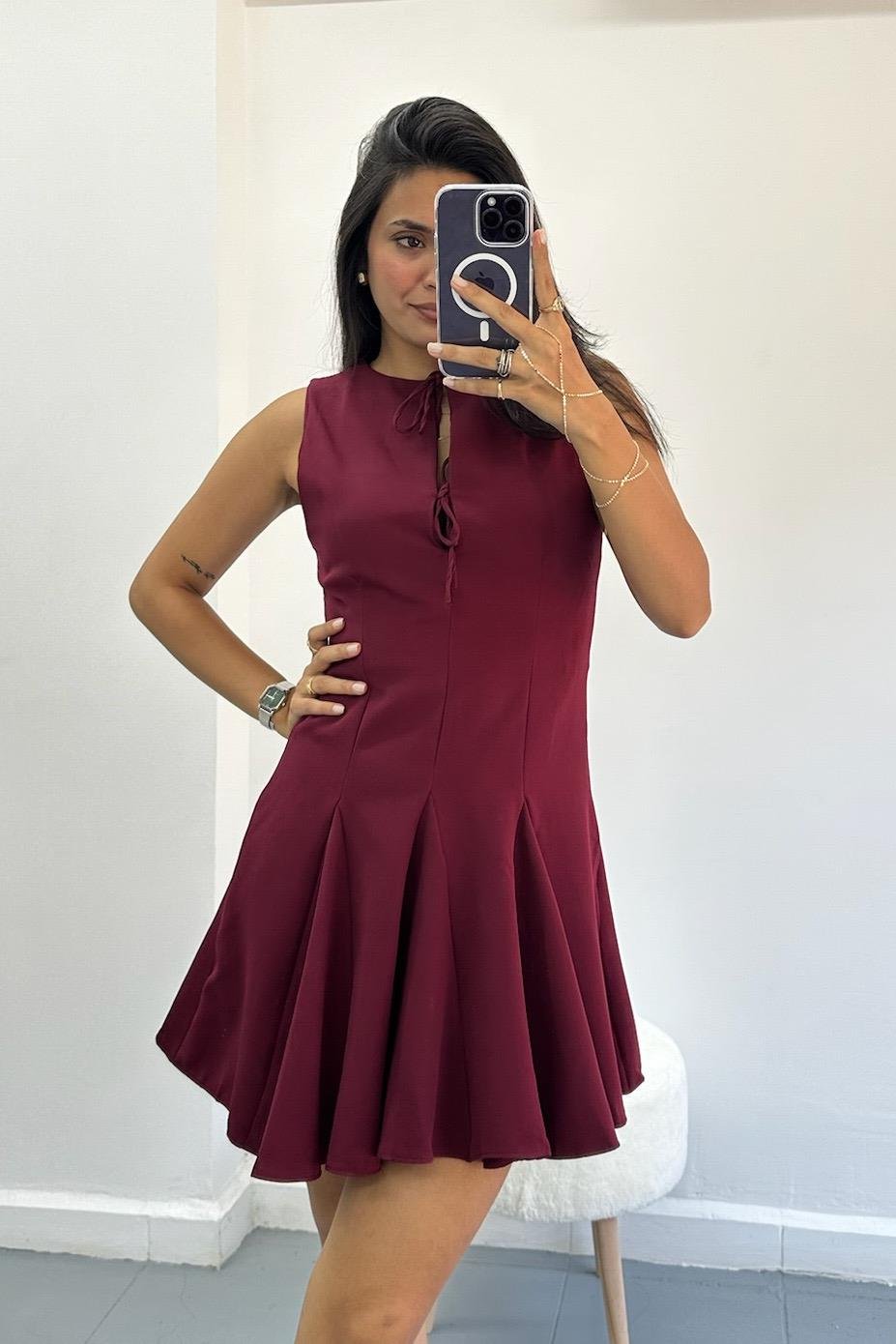Kolsuz Volanlı Bordo Elbise
