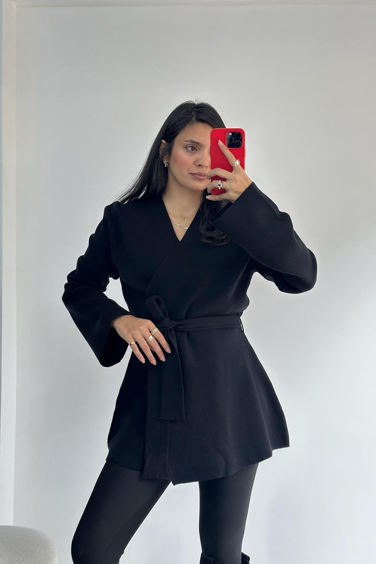 Kruvaze Kemerli Yün Karışımlı Siyah Triko Hırka