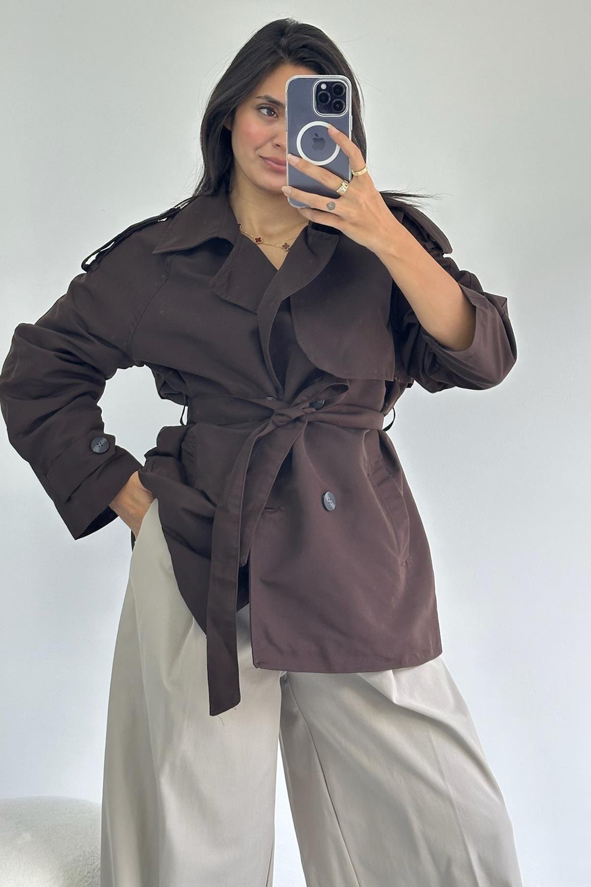 Kuşaklı Orta Boy Kahverengi Trençkot