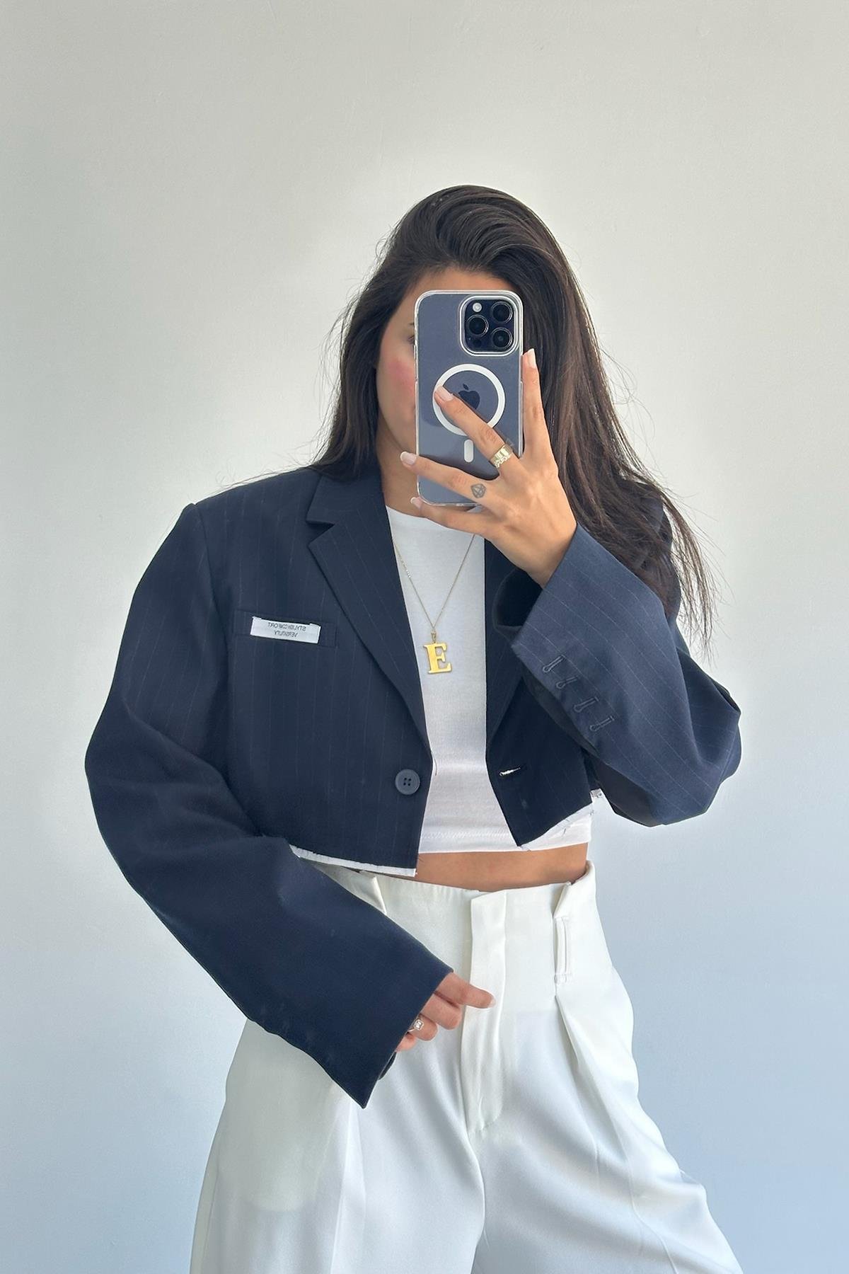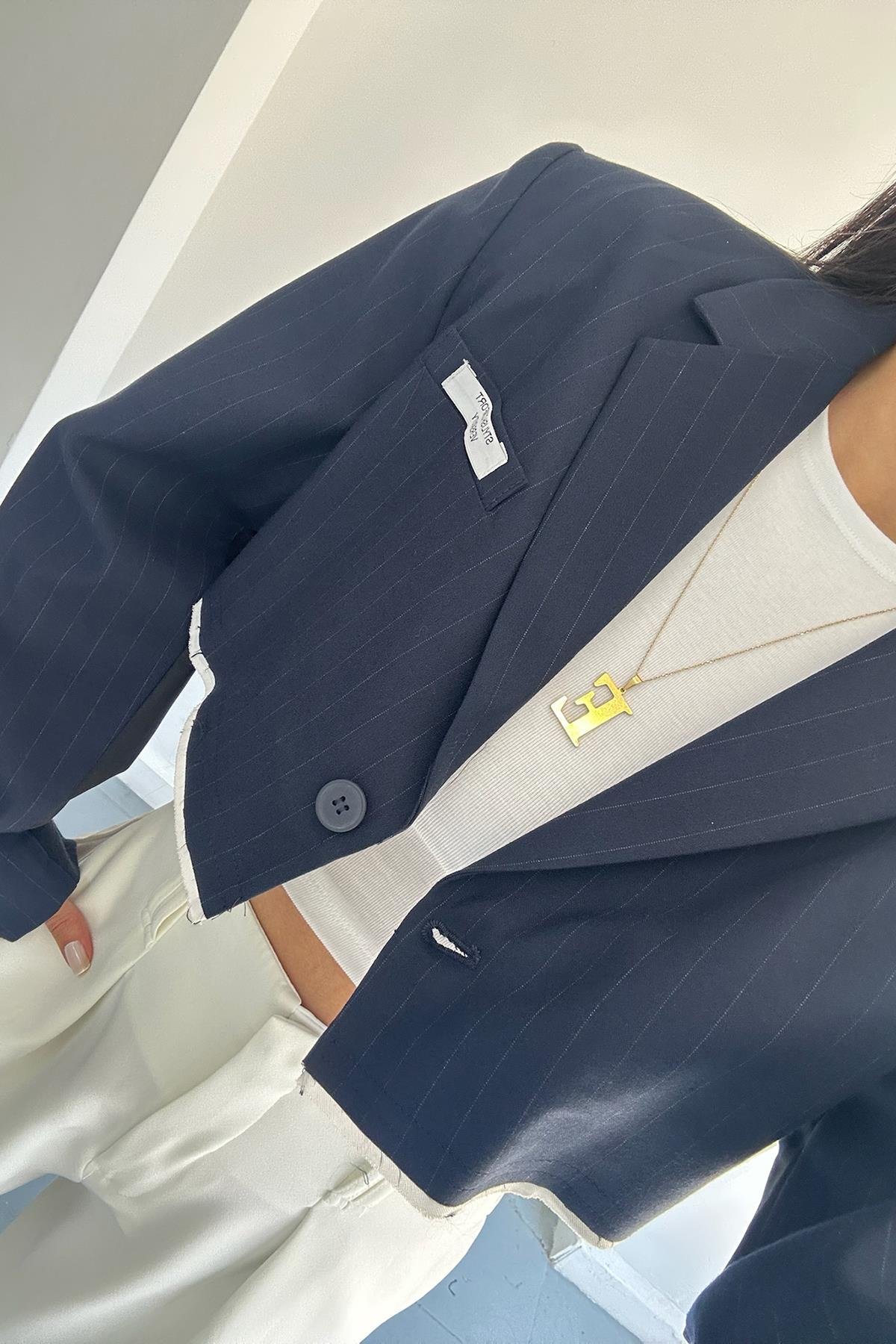 Lacivert Çizgili Mini Ceket