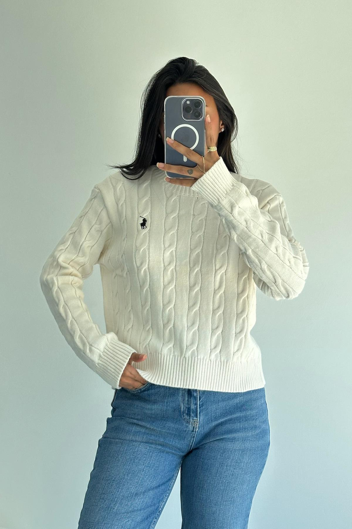 Minik Nakışlı Saç Örgü Bisiklet Yaka Krem Kazak