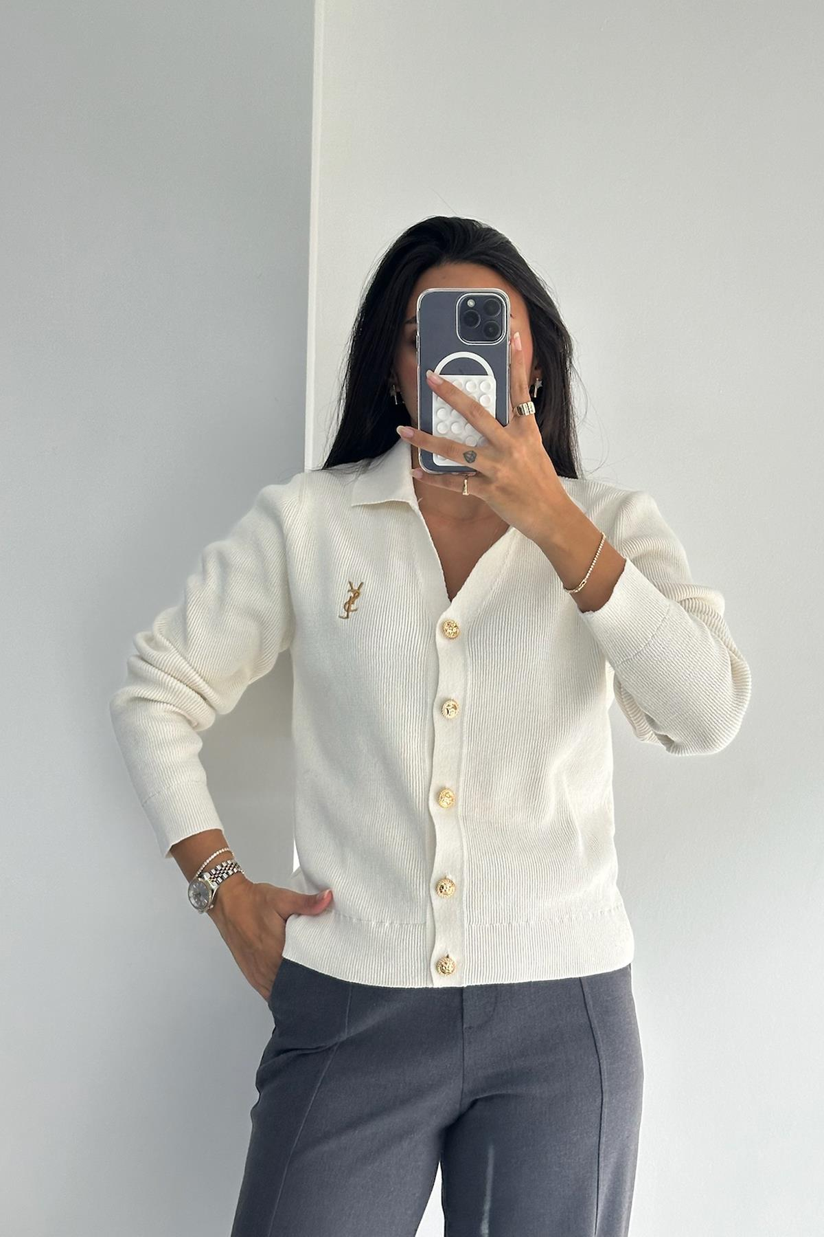Nakış Detay Gold Düğmeli Krem Triko Hırka