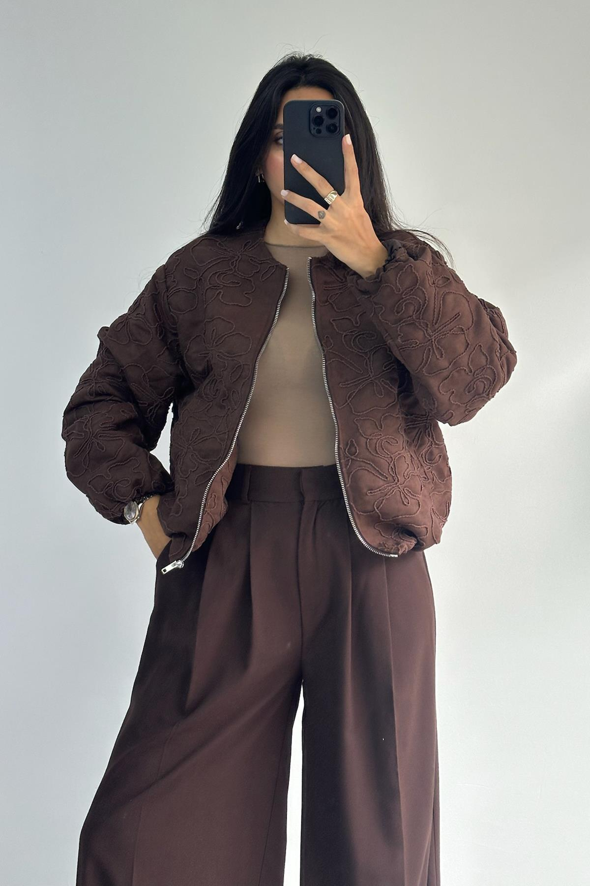 Nakışlı Kahve Bomber Ceket