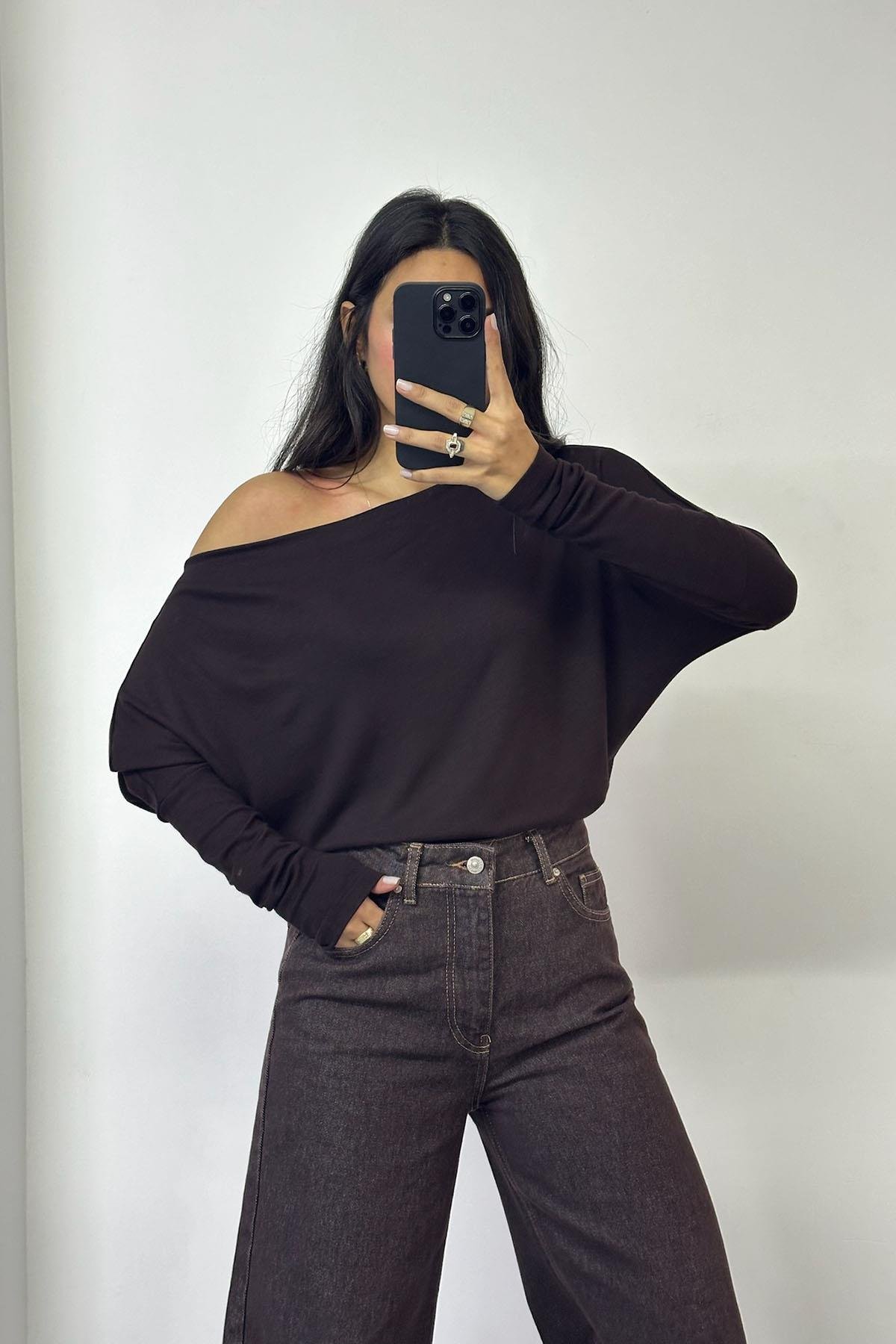 Omzu Düşük Kahve Bluz