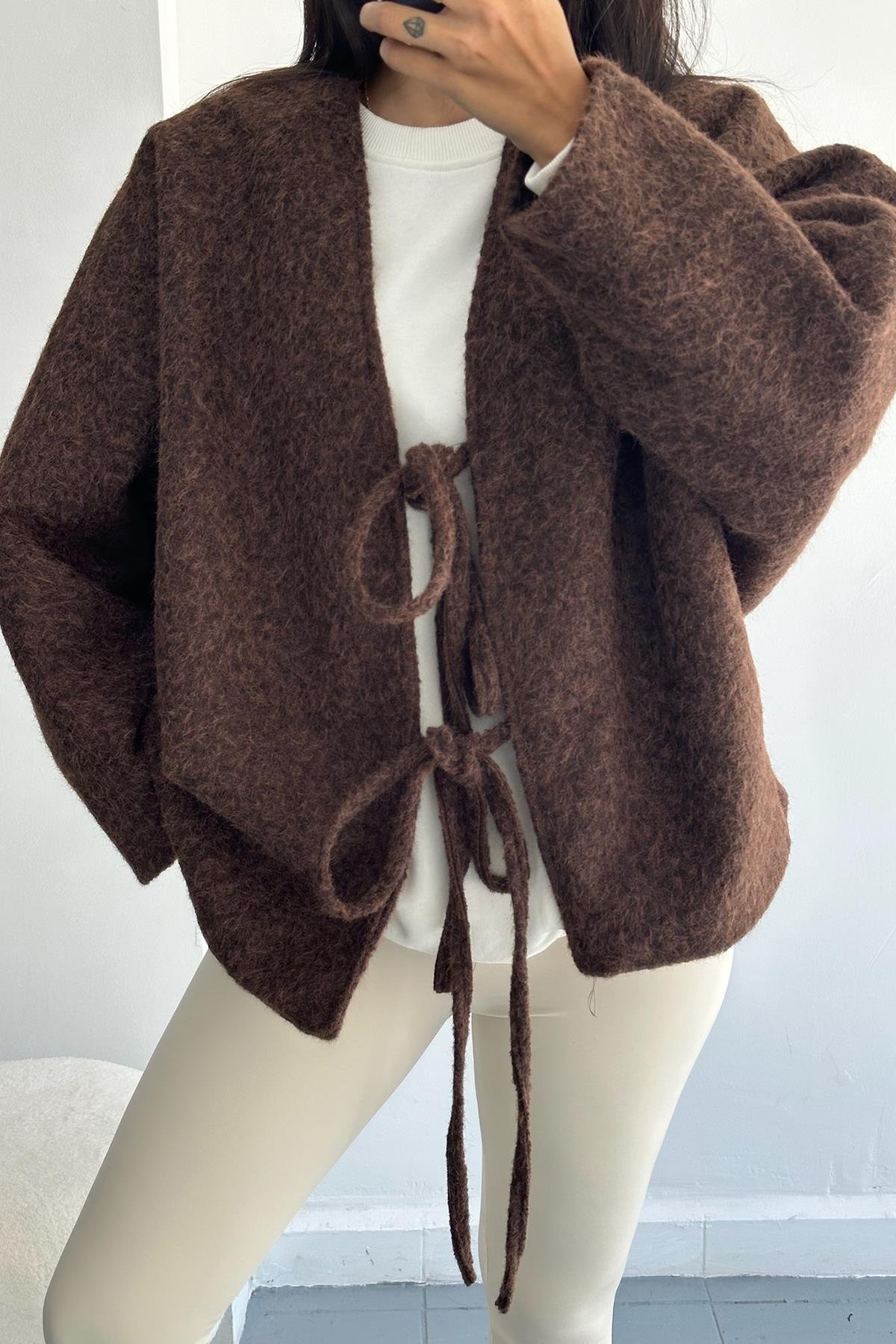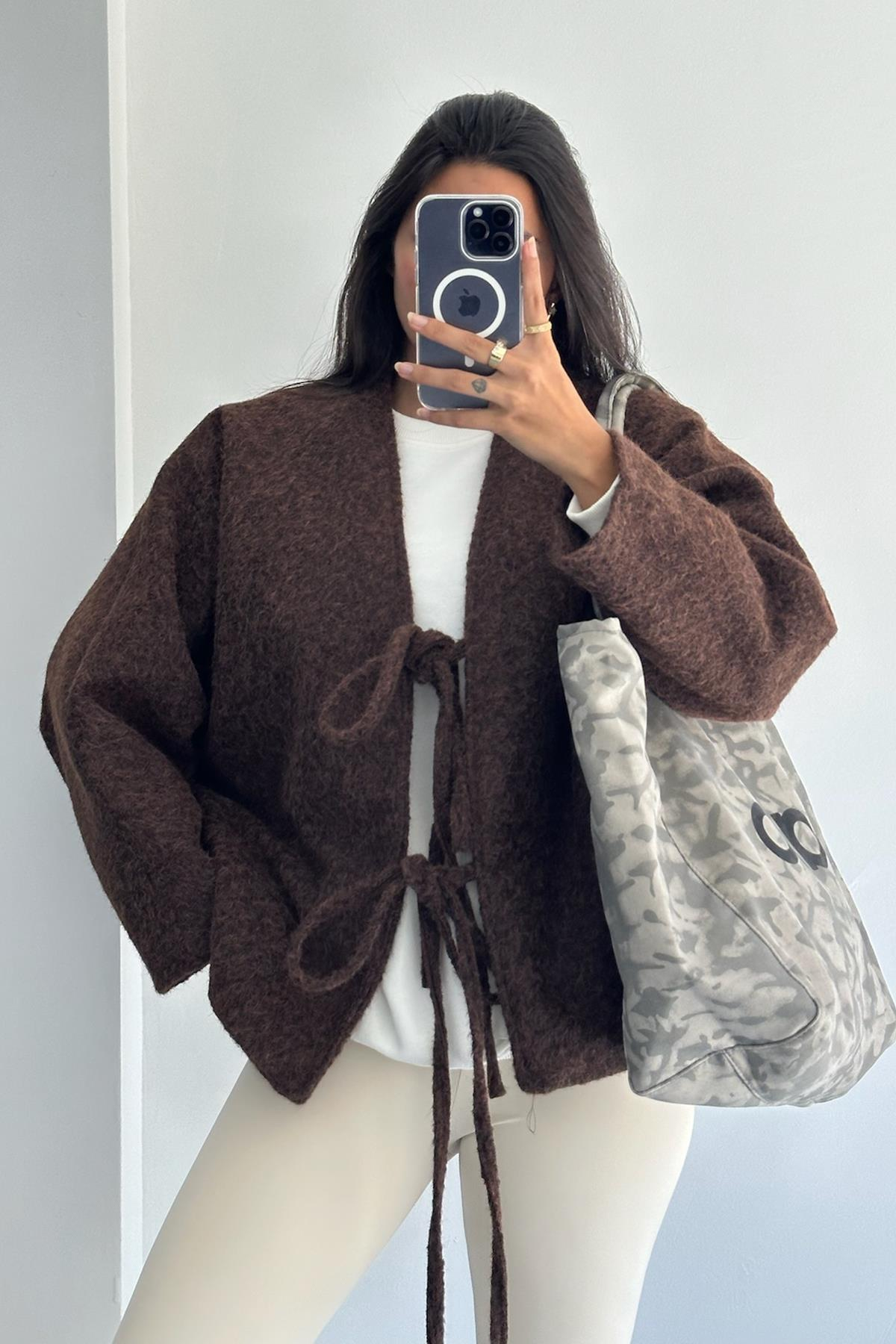 Önden Bağlamalı Kaşe Kahverengi Ceket