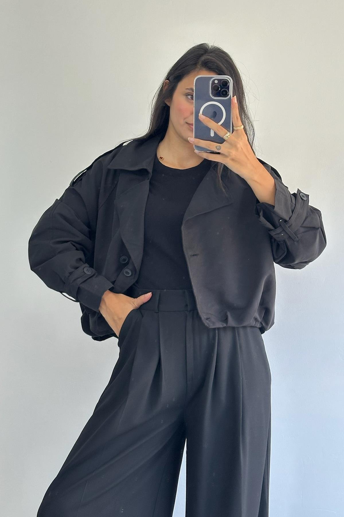 Önü Düğmeli Astarlı Siyah Kısa Trençkot