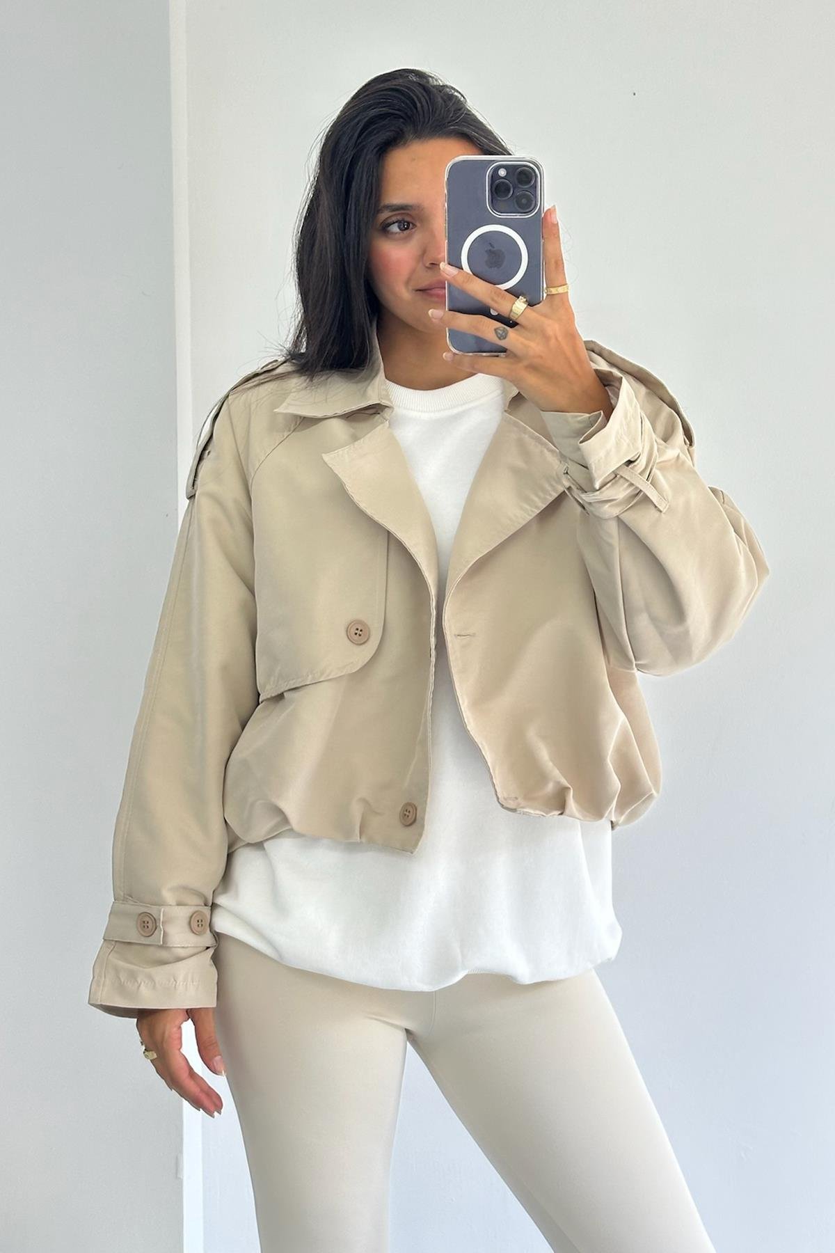 Önü Düğmeli Astarlı Taş Kısa Trençkot