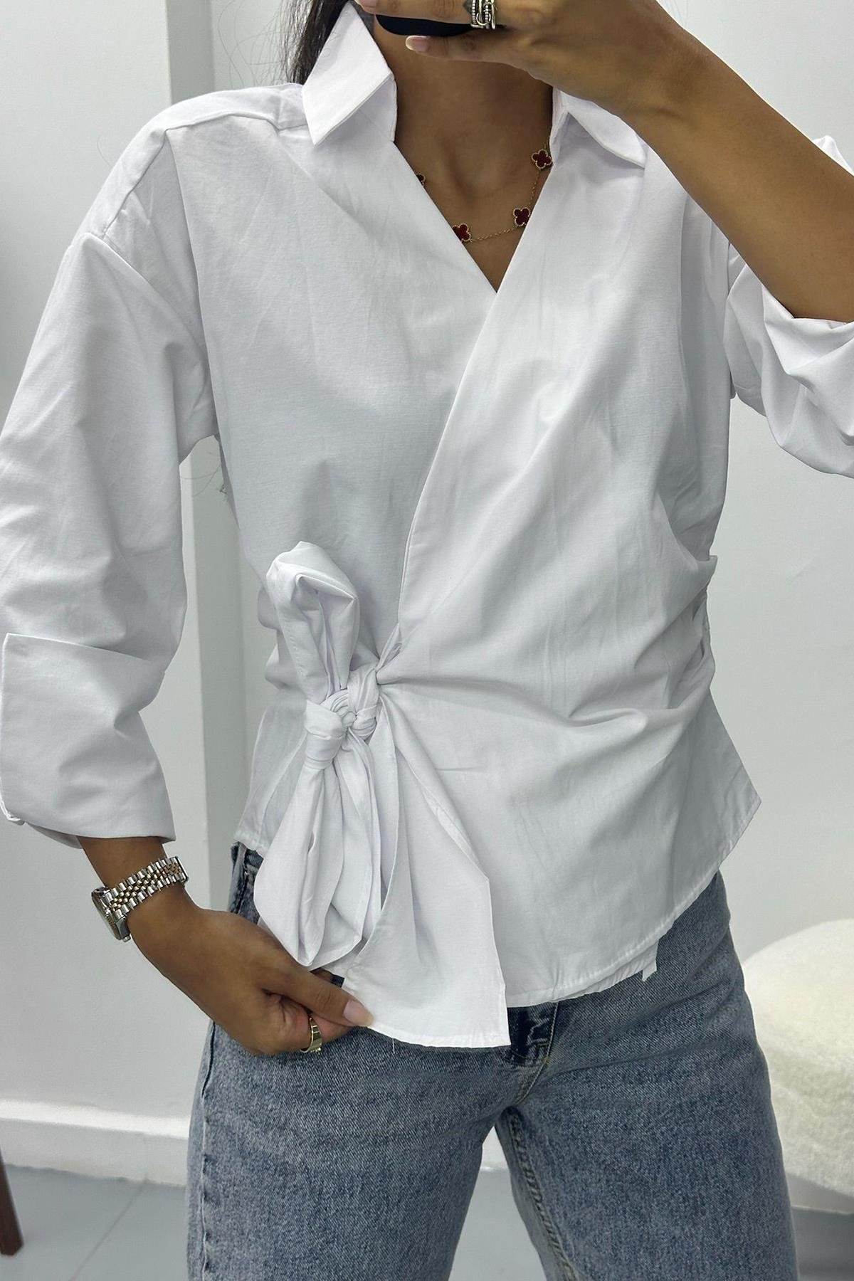 Önü Kruvaze Bağlamalı Beyaz Gömlek