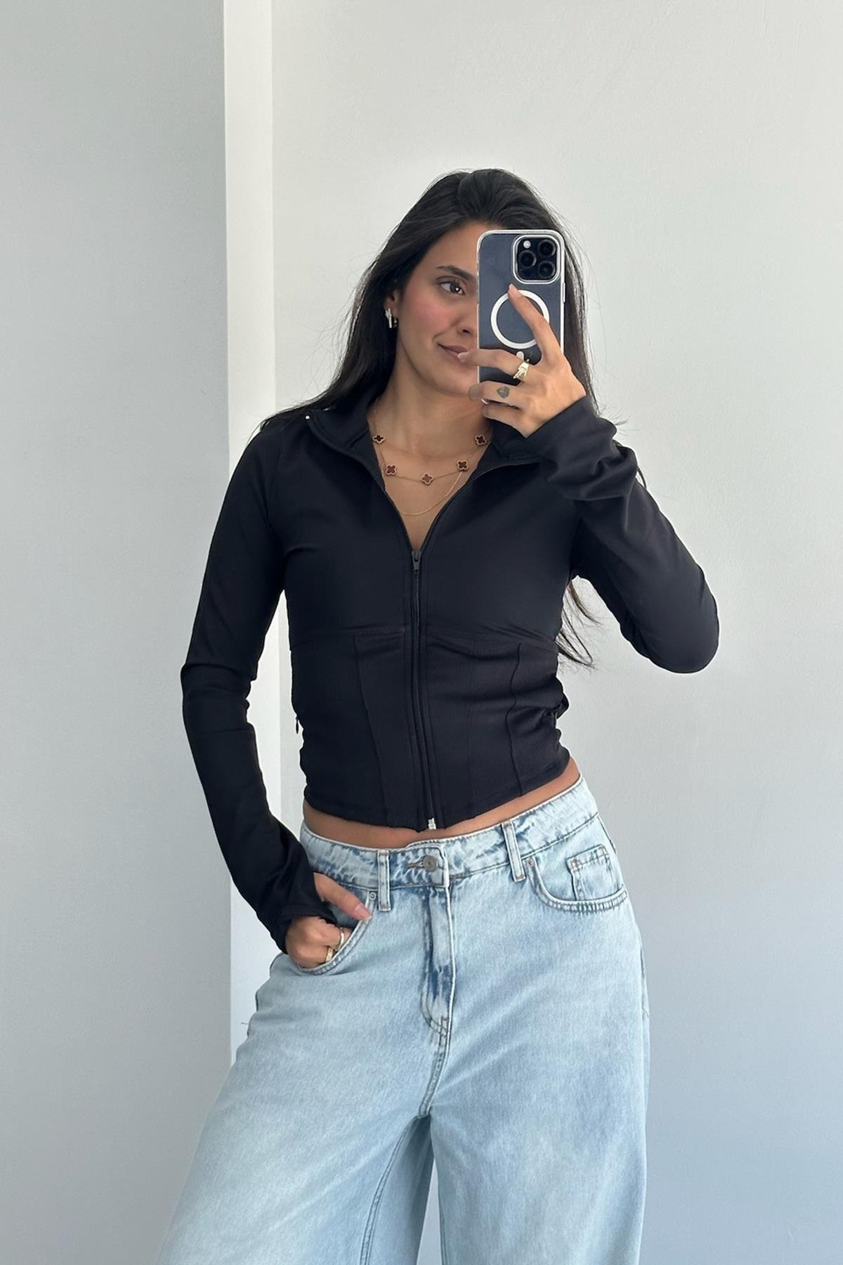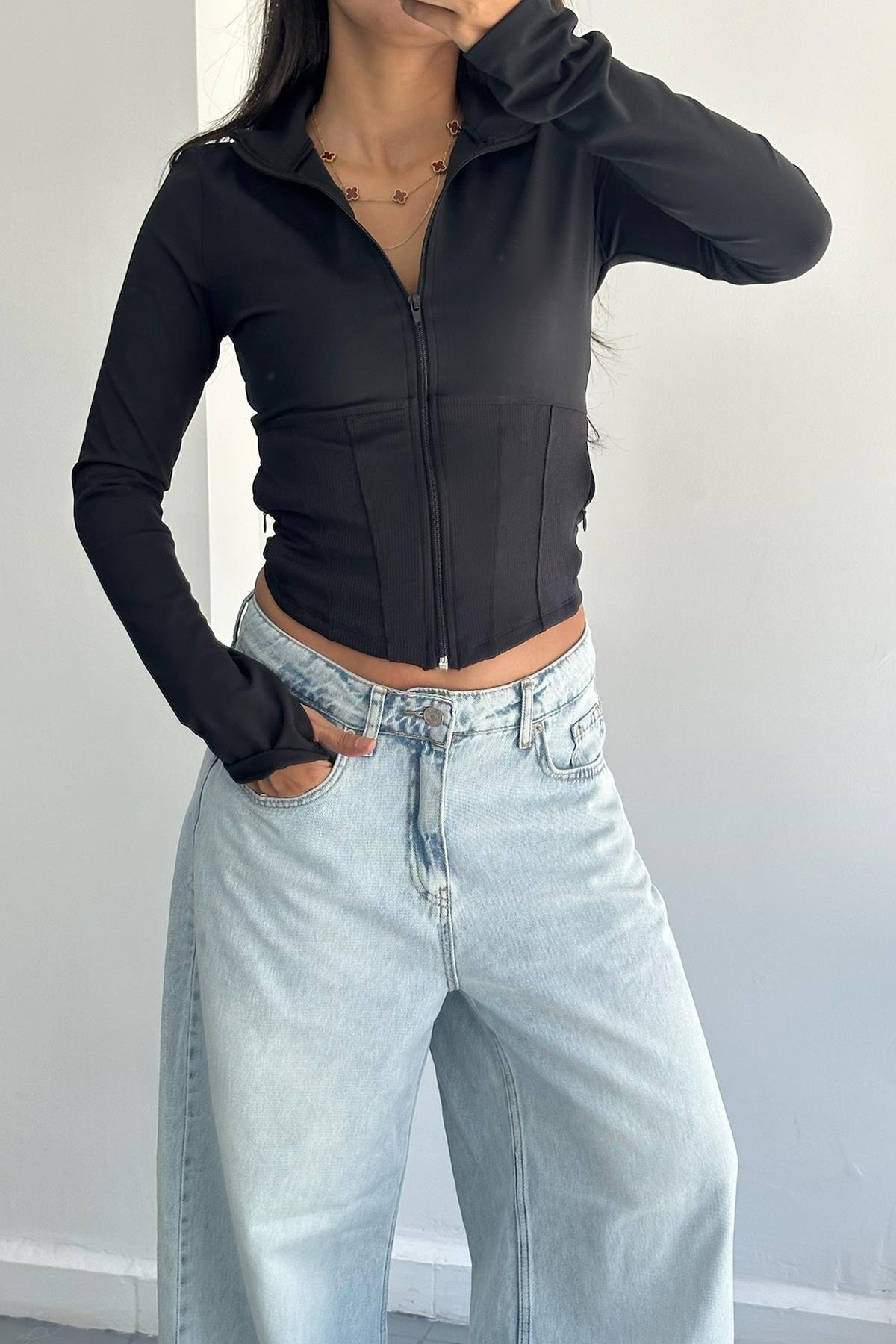 Parmak Detay Korseli Siyah Ceket